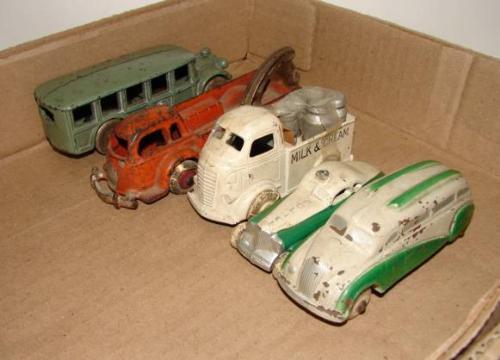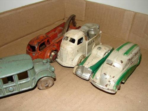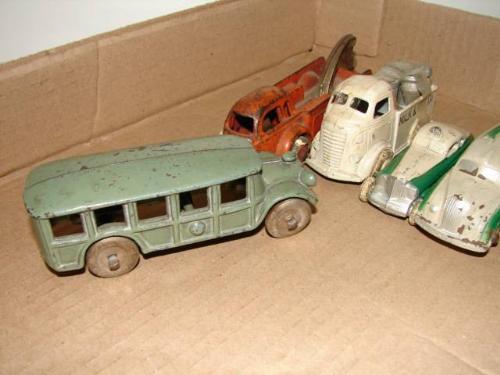 5 PIECE LOT OF ANTIQUE CAST IRON AND WHITE METAL VEHICLES. Comprising an orange wrecker, green bus, white milk truck, white and green police car, and white and green van.