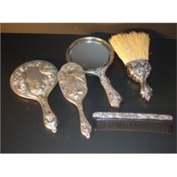5 ASSORTED PCS. OF SILVER PLATE ITEMS. Consisting of (2) mirrors, small broom, comb, & hair brush. Good overall cond. Small slight tarnishing to all pcs.