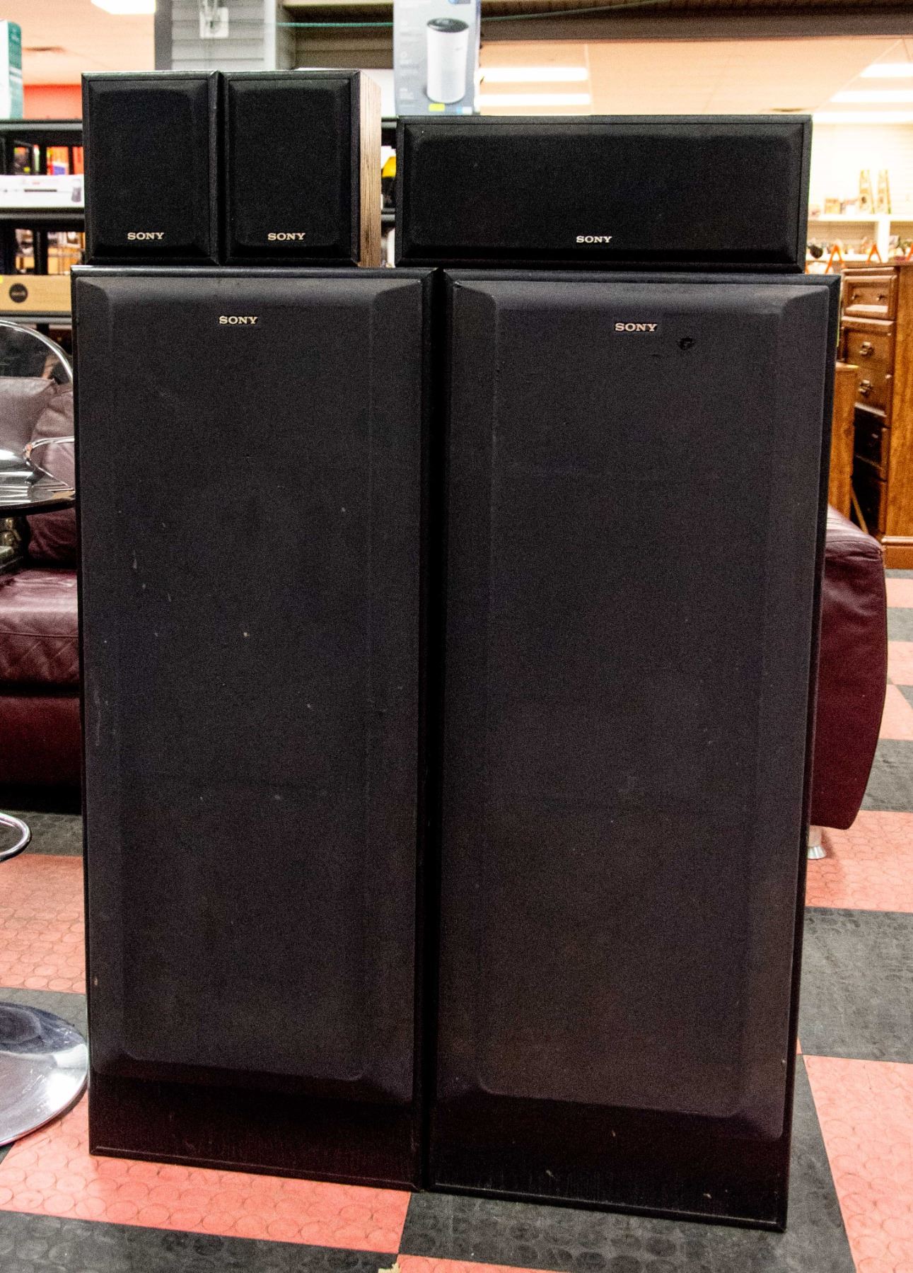 2 SONY SS-C 721AV 3-WAY SPEAKERS WITH 12 INCH WOOFER AND PASSIVE SUB, 2 BOOKSHELF SPEAKERS AND 1 CENTER SPEAKER - ALL ESPRESSO BLACK WOOD GRAIN