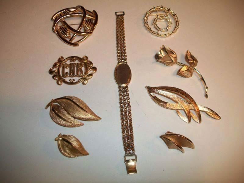 Two pins by Gerry's. Monocraft pin With CWB monogramming. Two gold Monet brooches and a Trifari pin with one matching earring, and one that does not. A rose pin by Giovanni. And a Speidel bracelet.