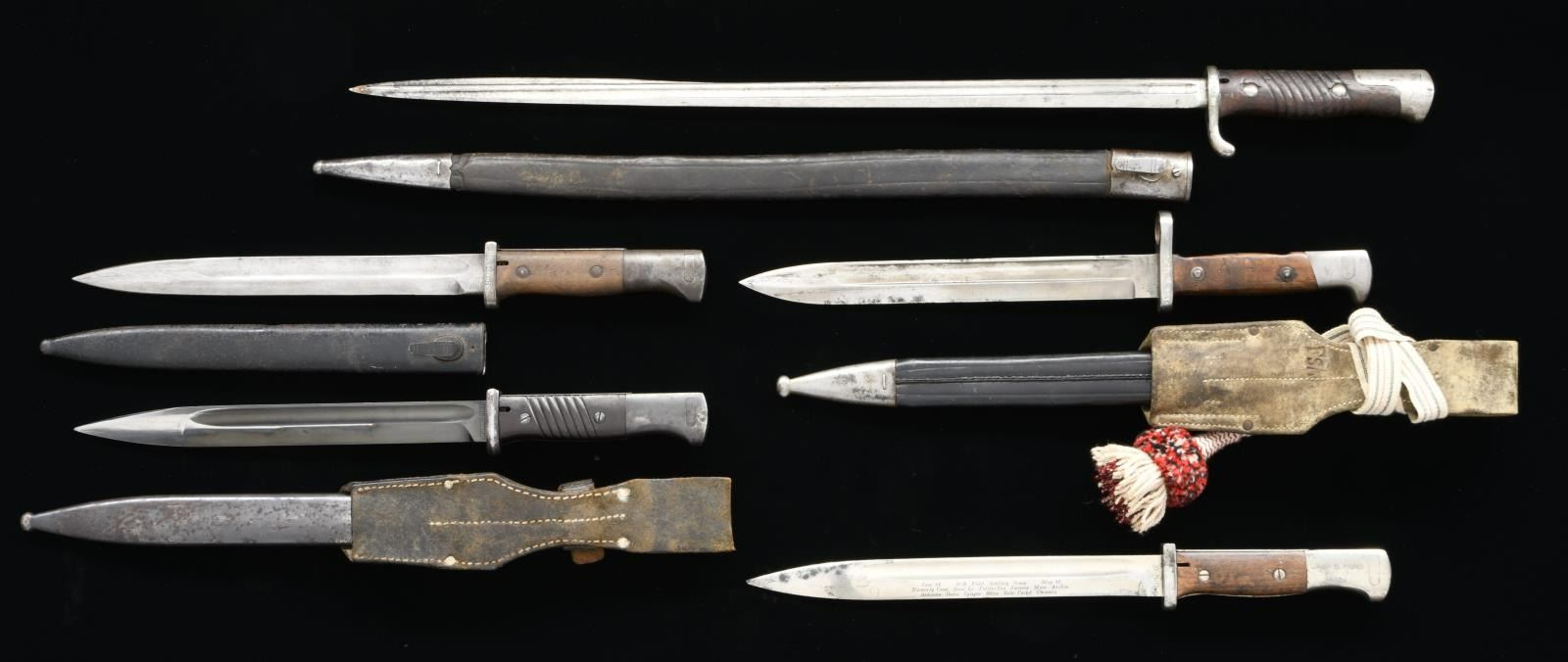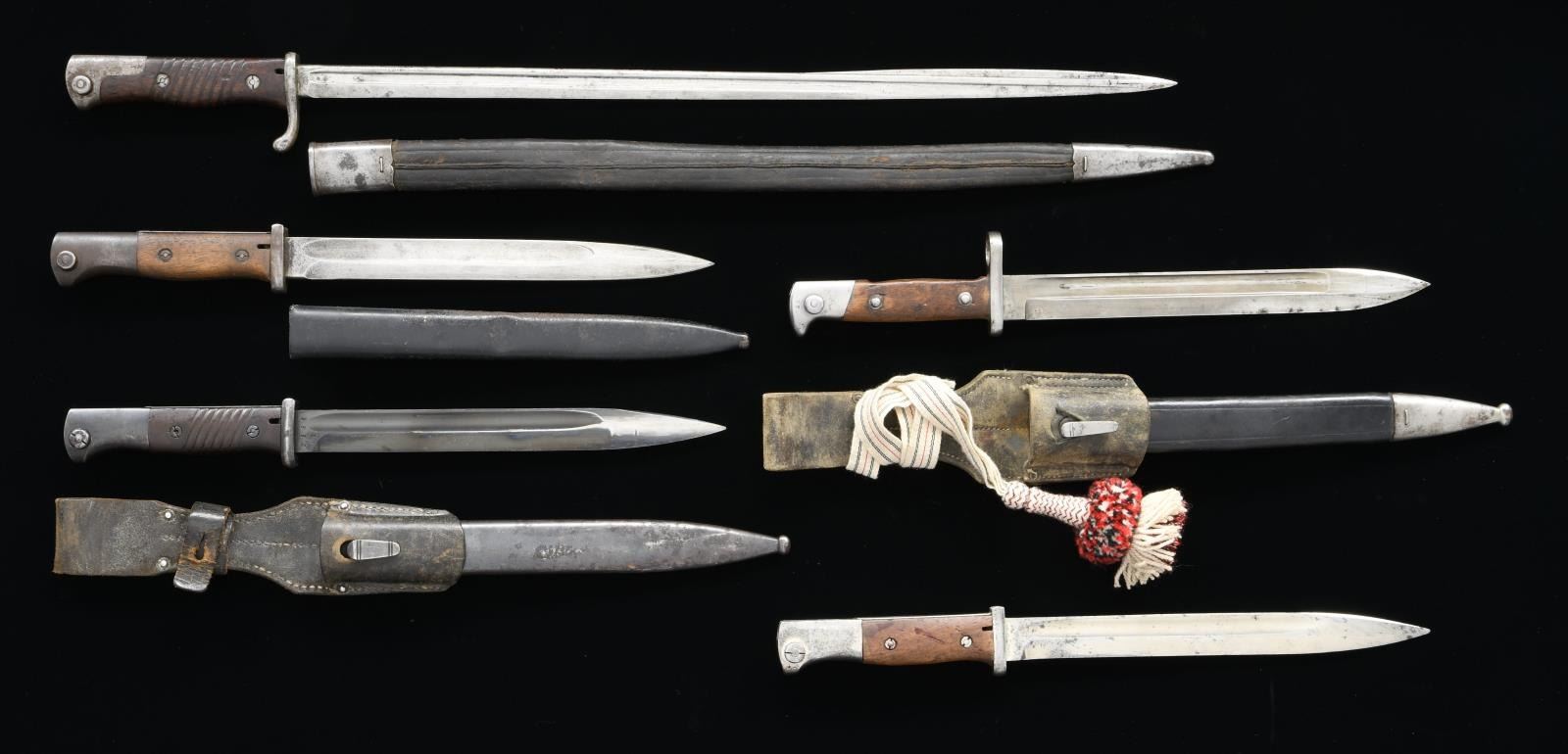 This group of bayonets includes 1 M1871/84 first model Mauser bayonet. Overall length: 17 1/2". Blade length: 10". Blade has a single medium fuller and is marked at the ricasso "WEYERSBERG KIRSCHBAUM & CO SOLINGEN". Iron/steel hilt with 2-piece wood grips. Steel/iron mounted leather scabbard with heavy leather frog. There is a black, red & white knot attached to the frog. / 1 M1884/98 second pattern Mauser bayonet measuring 15 7/8" overall with a 9 7/8" blade. Blade has a single medium fuller and is stamped at the ricasso "GOTTLIEB HAMMESFAHR SOLINGEN . ROCHE". Iron/steel hilt with 2-piece wood grip. Iron/steel scabbard. / 1 WWII Mauser K98 bayonet dated 1939. Overall length: 16 3/4". Blade length: 10". Blade has a single medium fuller and is marked at the ricasso "GEBR. HELLER". The bayonet & scabbard are both numbered "3866". Steel hilt with 2-piece composite grips. Steel scabbard with leather frog. / 1 M1898 epee bayonet. Blade has a single narrow fuller and is stamped at the ricasso "FREURT (crown)". The spine has 2 arsenal marks. Steel/iron hilt with 2-piece wood grips. Steel/iron mounted leather scabbard. / 1 Mauser K98 bayonet captured by and engraved "Jack D. Ford". The blade is plated & engraved "June 44 18th Field Artillery Group May 45 Normandy Coast Saint Lo Falaise Gap Soissons Mons Aachen Ardennes Duren Cologne Rhine Ruhr Pocket Chemnitz". The ricasso is marked "W.K.C." Plated hilt with 2-piece wood grip. No scabbard. CONDITION: all bayonets show light to moderate wear with no notable damage. PROVENANCE: From the Lifelong Collection of Glen E. Mattox. (02-18318/BF). $400-600.