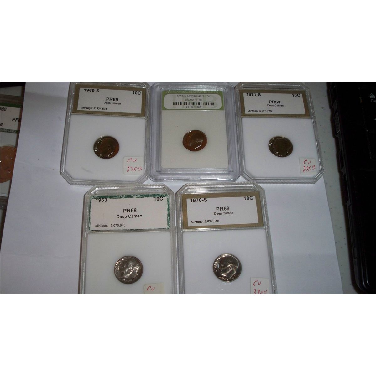 5 PROOF 90% SILVER ROOSEVELT DIMES. 1963 PROOF-68,1969-S PROOF69, 1970-S PROOF 69,1971-S PROOF 69, 2005-S PROOF 70
