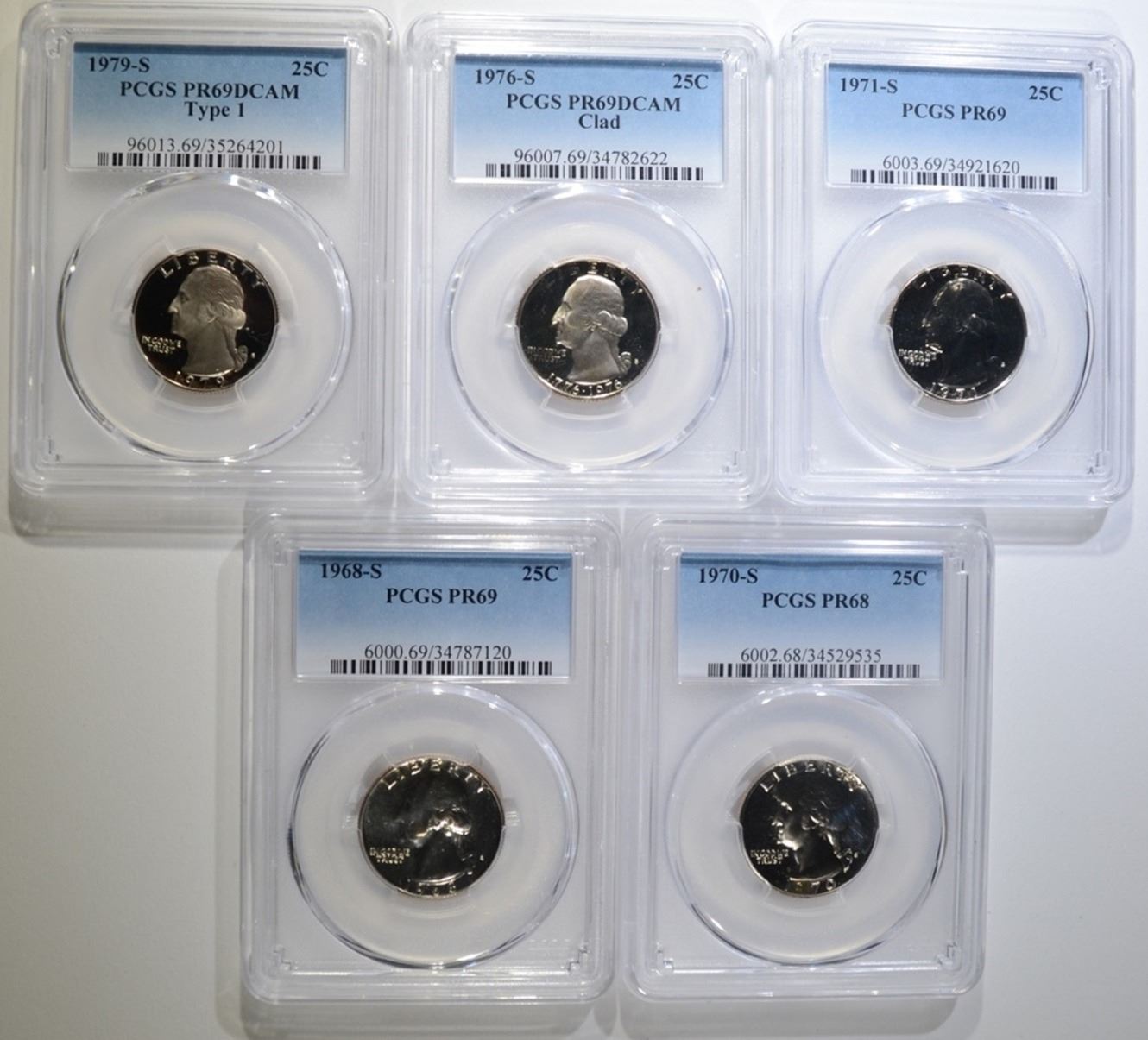 1968-S, PR-69 70-S PR-68, 71-S PR69, 76-S CLAD PR-69DCAM, 79-S TYPE 1 PR-69 DCAM ESTIMATE $150 - $200.