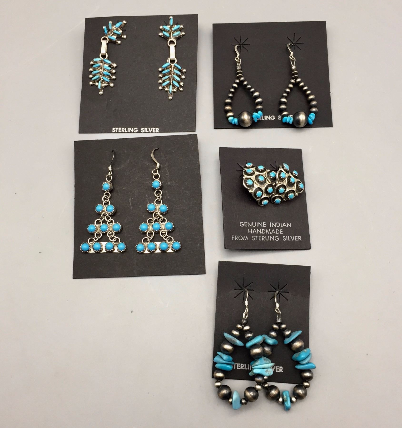 Maker: Unknown. Approx. Fairly modern. Size: Earrings measure approx. 5/8” x 1” to 3/4” x 2”. Lot weighs 29.4 g. Additional Info: 5 pair of turquoise and sterling silver (pierced) earrings. Condition: Good, normal wear expected. New, old stock (NOS). Please look closely at the pictures - they are an important part of our description. Shipping: There will be a $5 handling / packaging fee for shipping this lot. The actual cost of postage will be added on top of that.