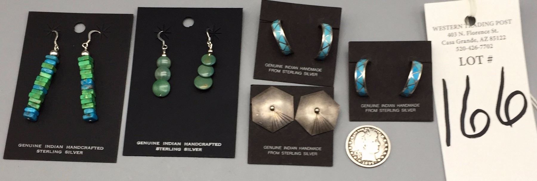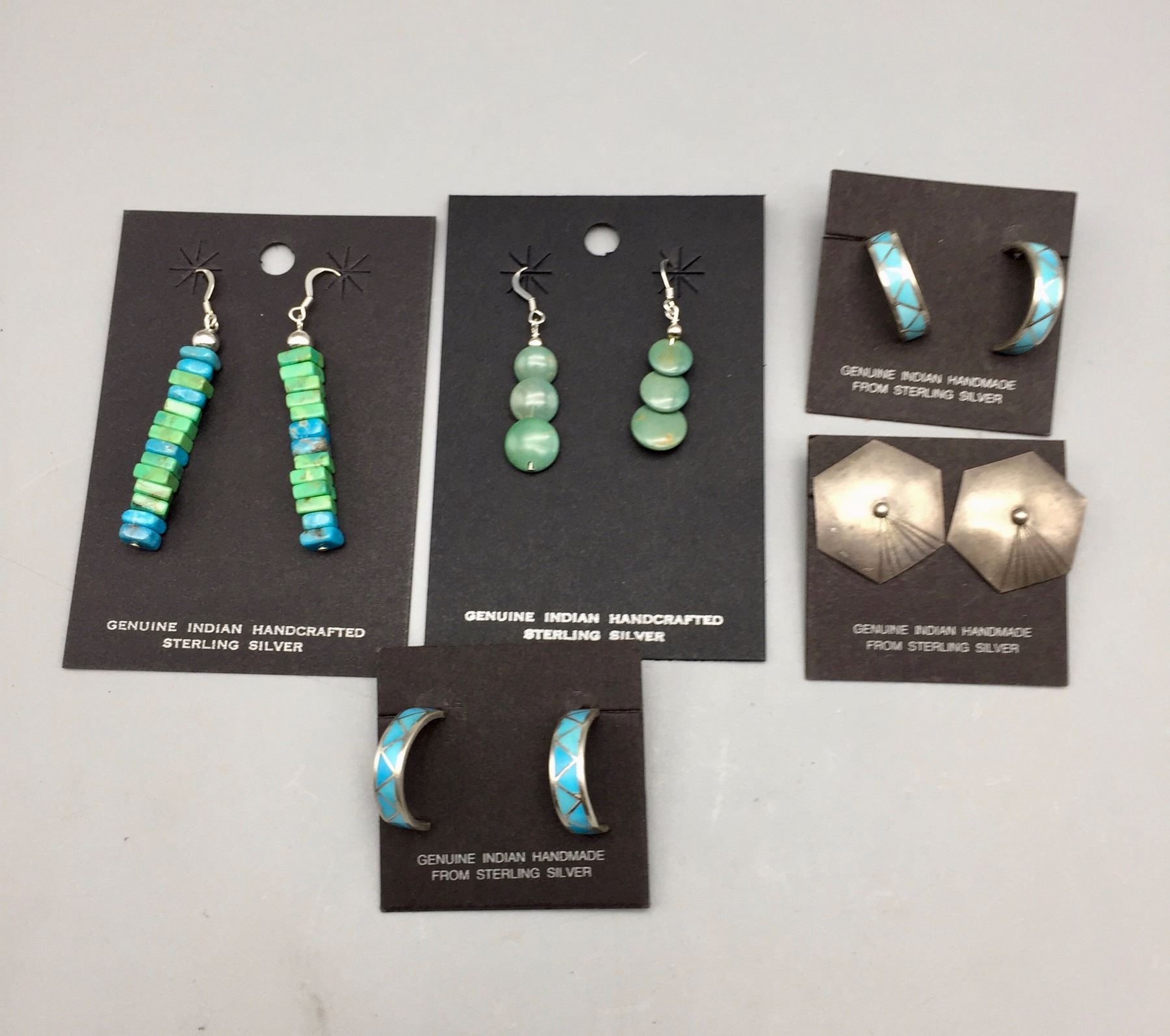 Maker: Various makers. Approx. Age: Fairly modern. Size: Earrings measure approx. 3/4” to about 2” in length. Lot weighs 26.0 g. Additional Info: 5 pair of turquoise and sterling silver (pierced) earrings. Condition: Good, normal wear expected. New, old stock (NOS). Please look closely at the pictures - they are an important part of our description. Shipping: There will be a $5 handling / packaging fee for shipping this lot. The actual cost of postage will be added on top of that.