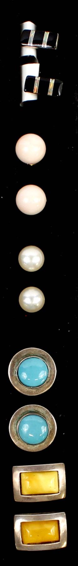 5 Pairs of Post Earrings, Some Sterling, includes 1. Navajo Sterling Onyx and Opal Posts, measure 3/8'' x .25'', hallmarked and stamped sterling 2. Angel Coral Posts, measure 3/8''D 3. Pearl Posts, measure .25''D 4. Turquoise Posts, appear to be sterling hoever unmarked, measure .5''D 5. Sterling & Yellow Lip Shell Posts, measure 5/8'' x 3/8'', marked .925