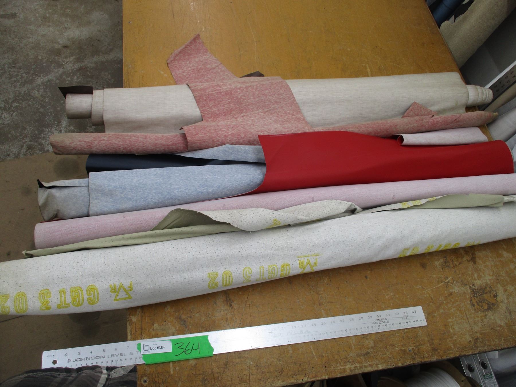 (5) Partial Rolls Upholstery Material - Tope Perforated Vinyl, Yellow, Brown, Red Vinyl