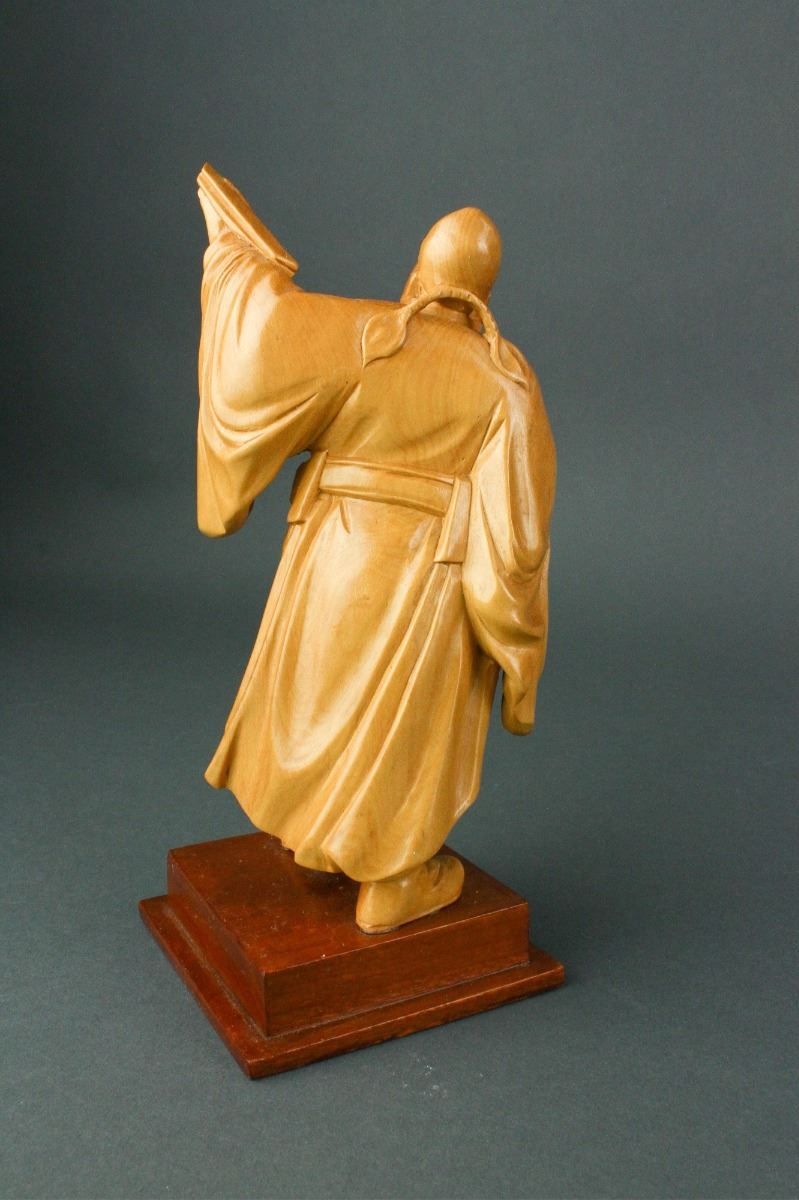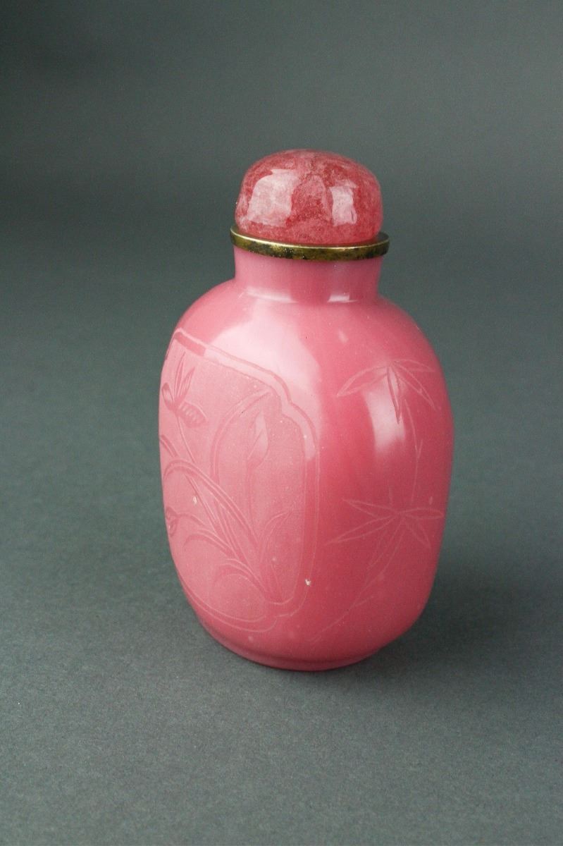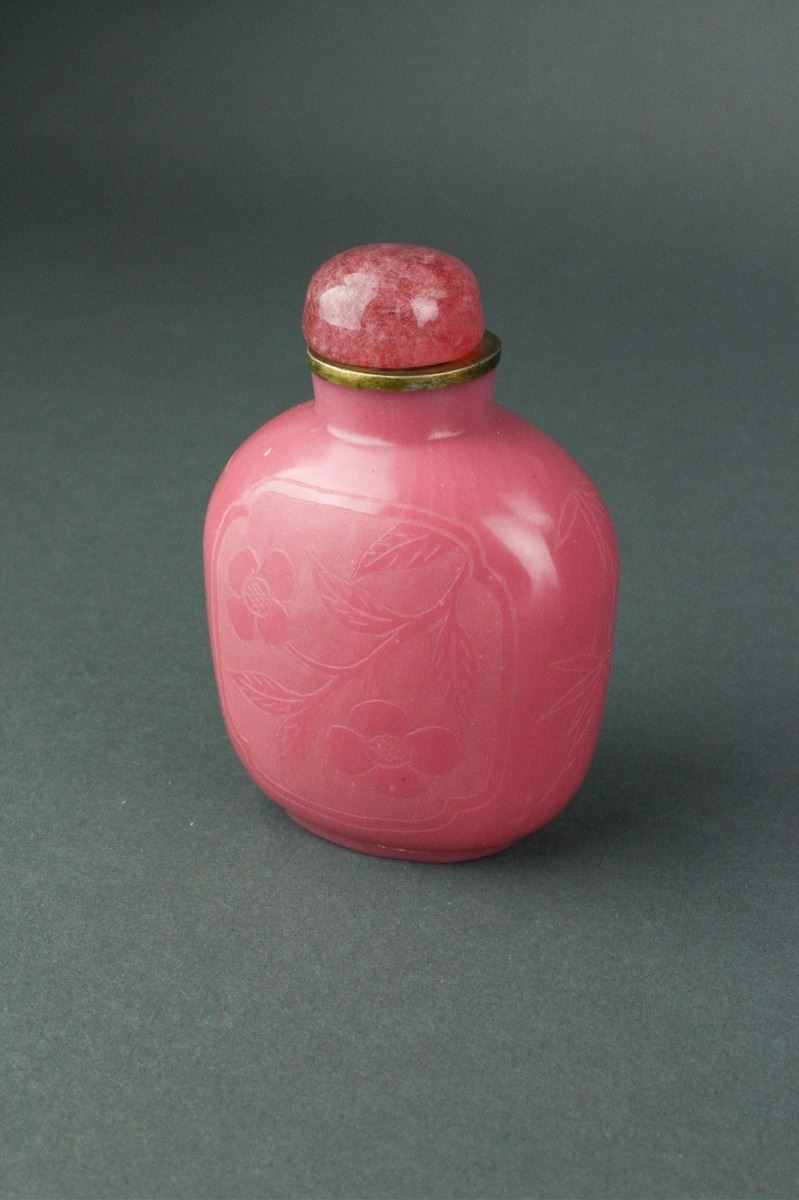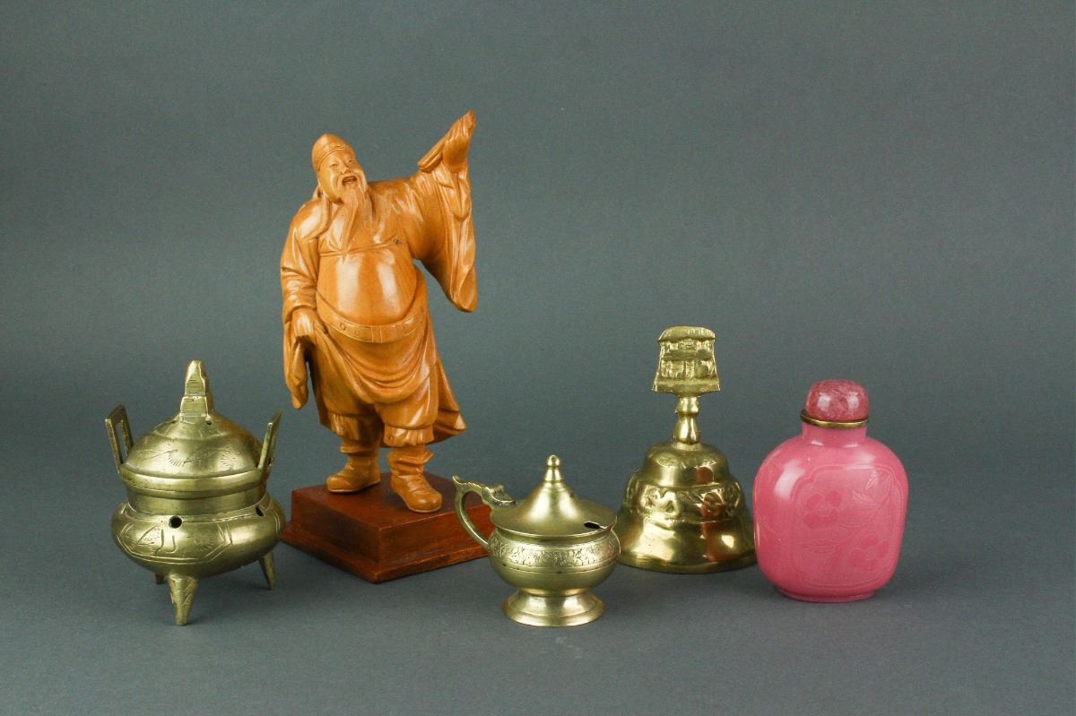 Five pieces of Chinese decorative items; comprised of a pink Peking glass snuff bottle, a boxwood scholar figure and three bronze items with Ming Xuande mark; H: 18 cm, W: 8 cm, 1053 grams total