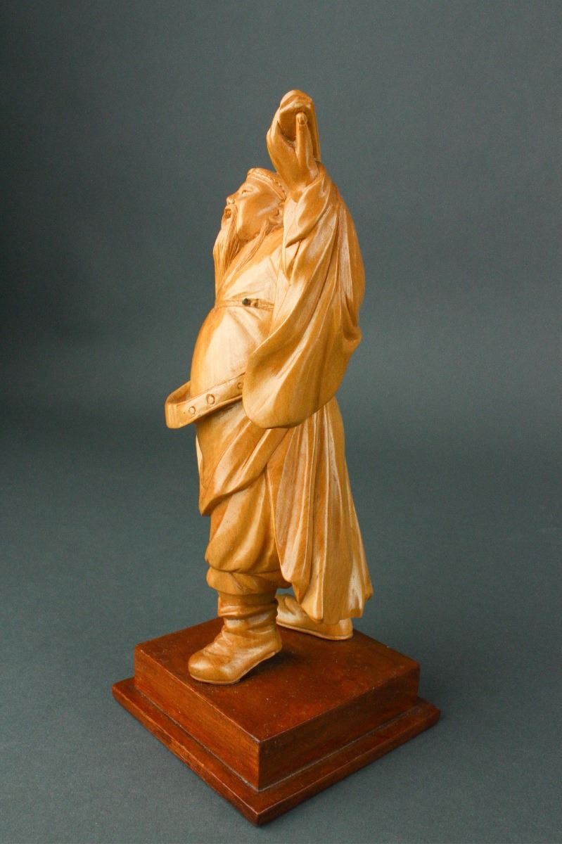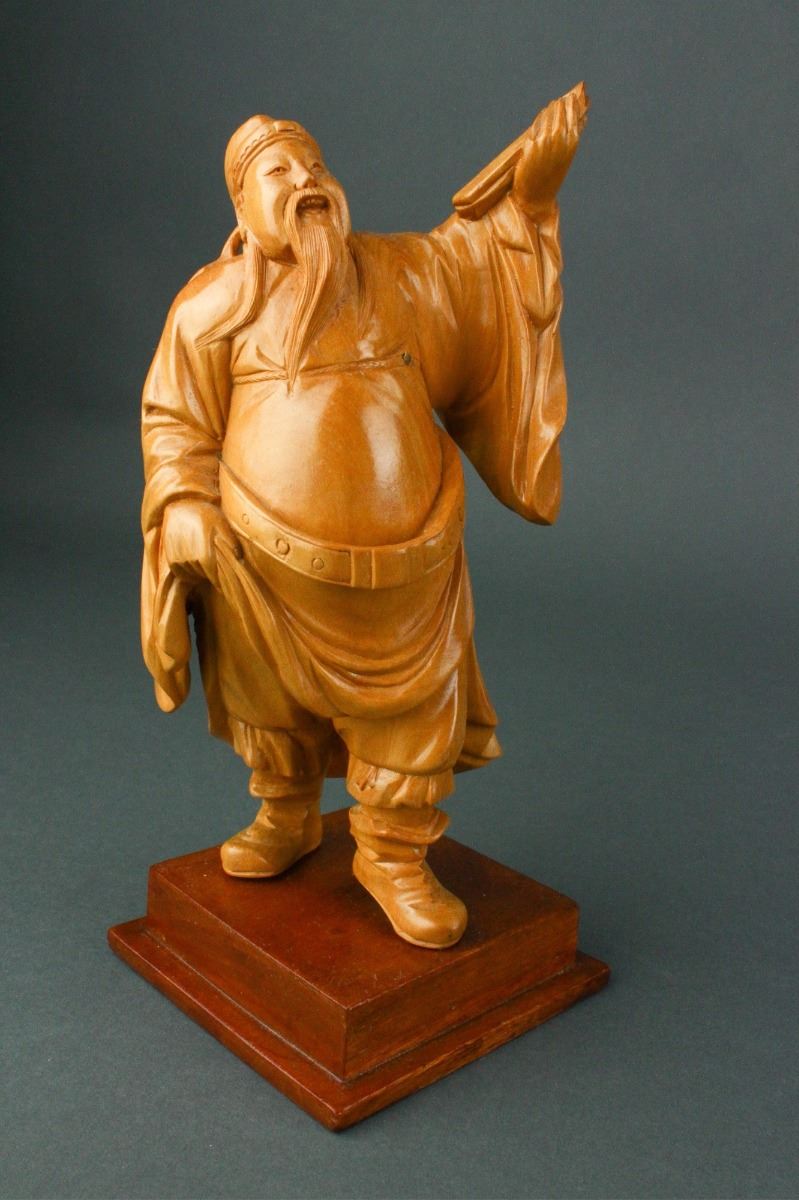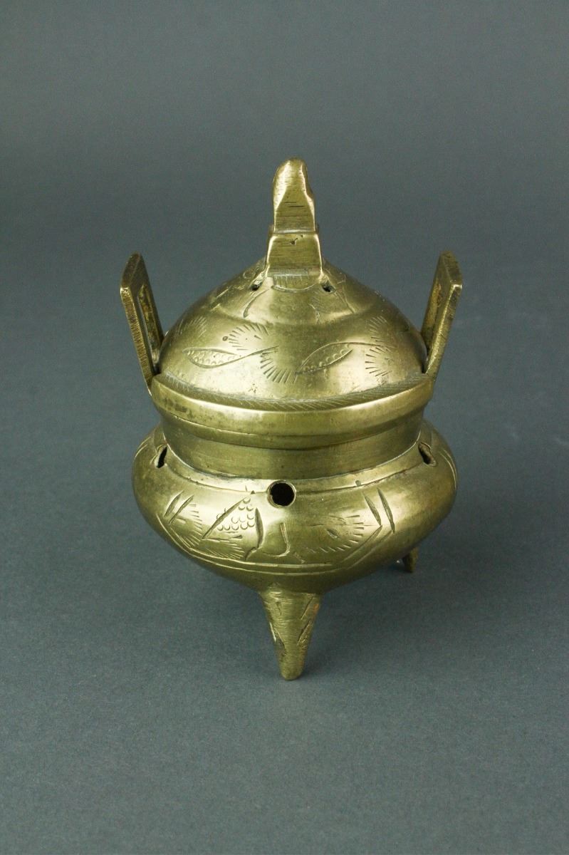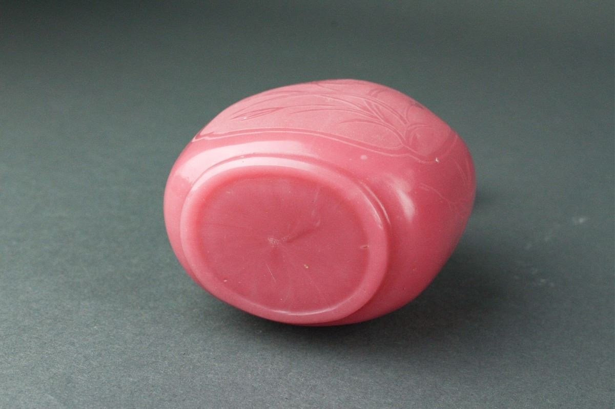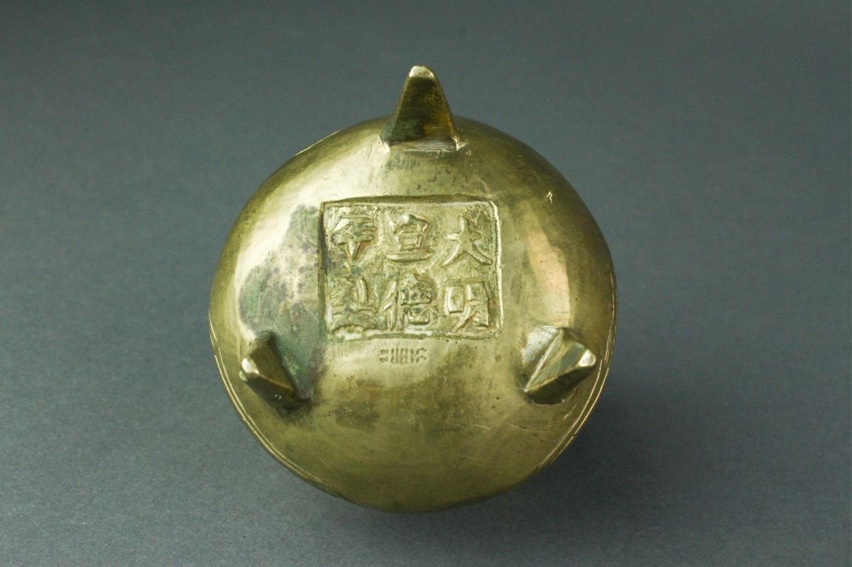 Five pieces of Chinese decorative items; comprised of a pink Peking glass snuff bottle, a boxwood scholar figure and three bronze items with Ming Xuande mark; H: 18 cm, W: 8 cm, 1053 grams total