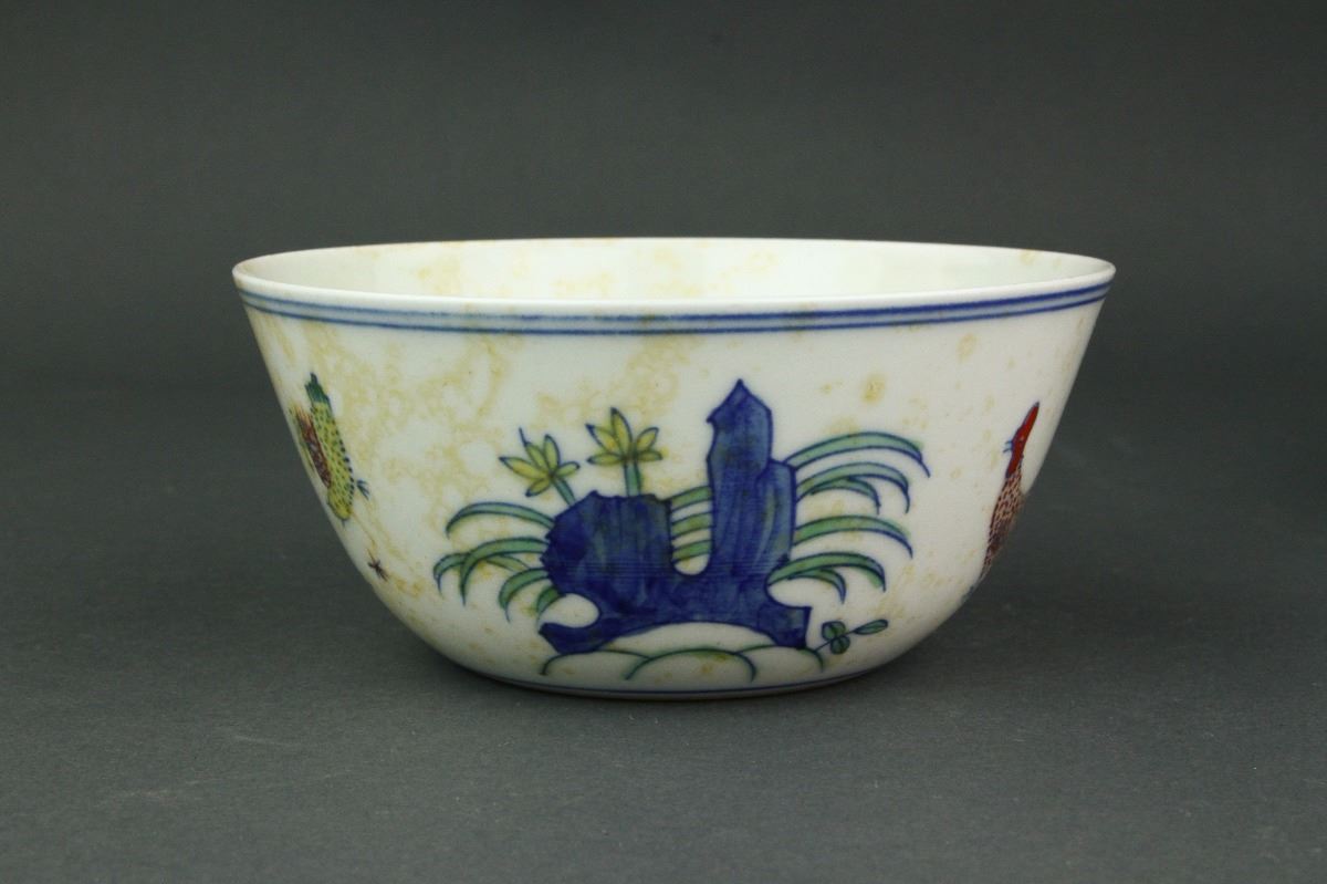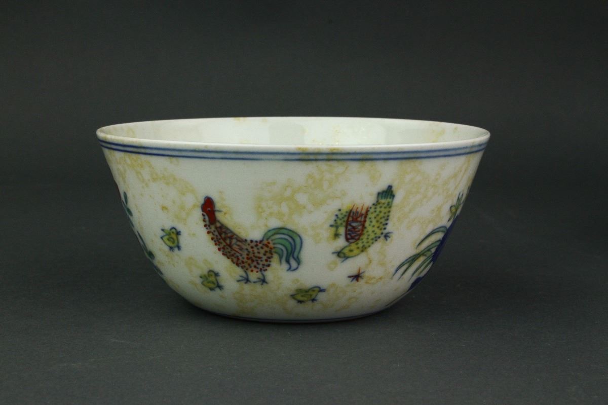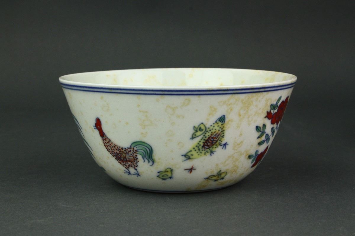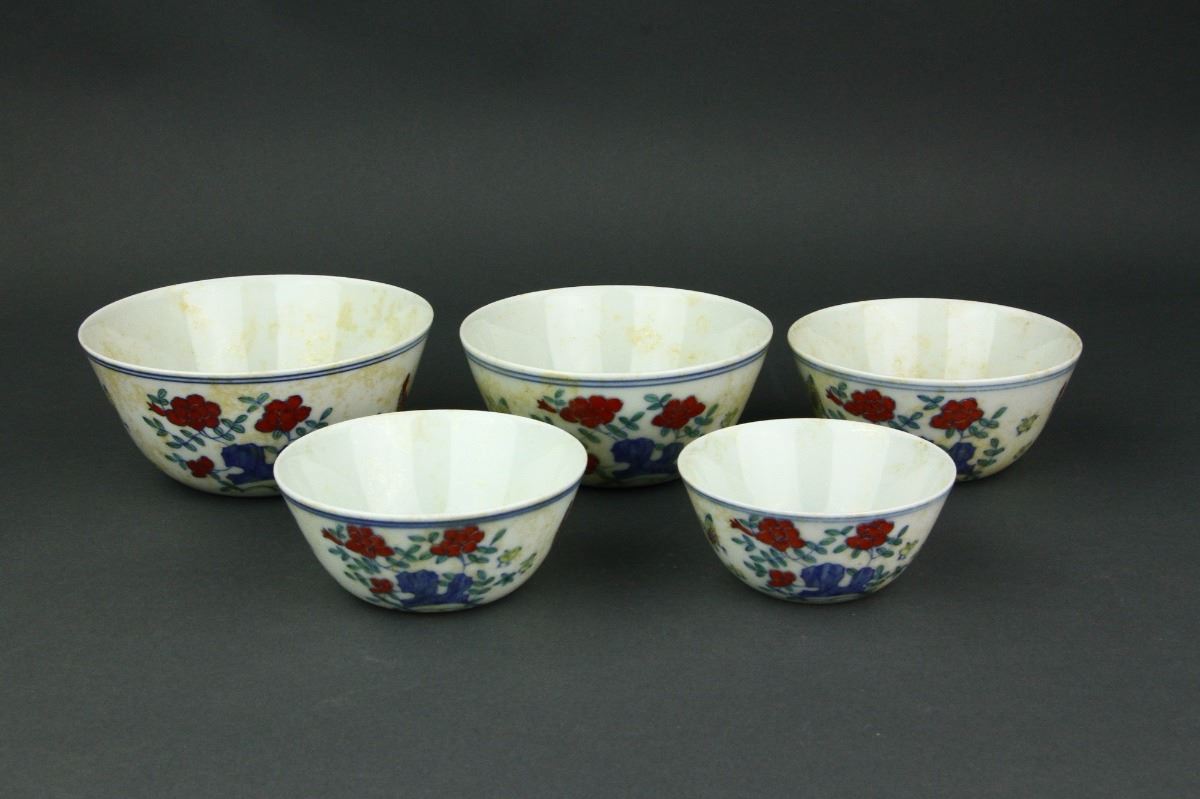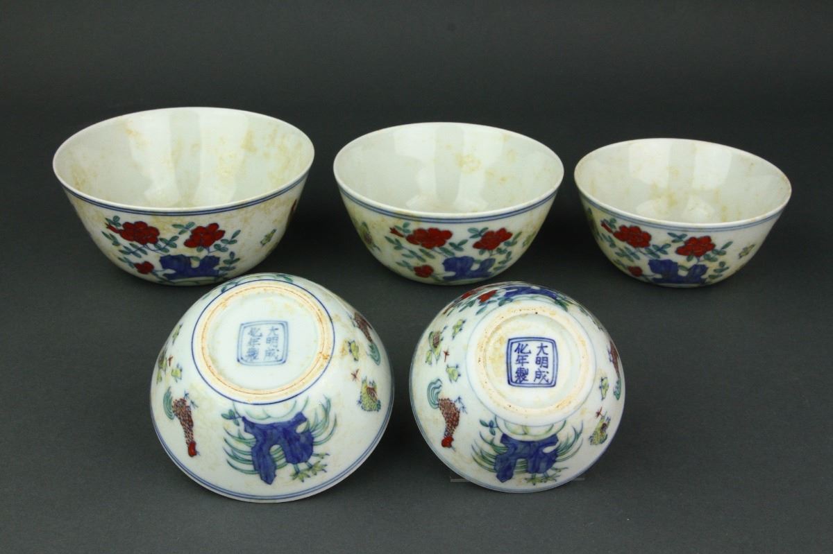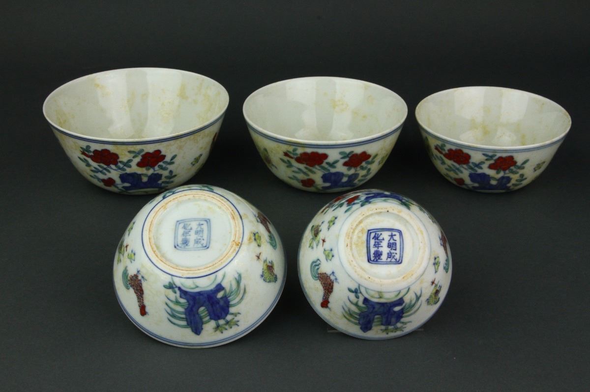 Five pieces of Chinese Doucai porcelain cups; of deep rounded sides; featuring chicken and peonies on body; six-character Ming Chenghua mark on base; H: 5.5 cm, D: 12.5 cm, 394 grams total
