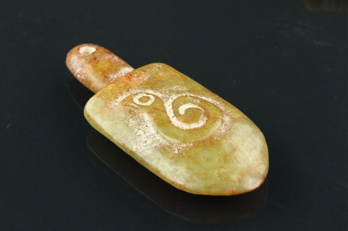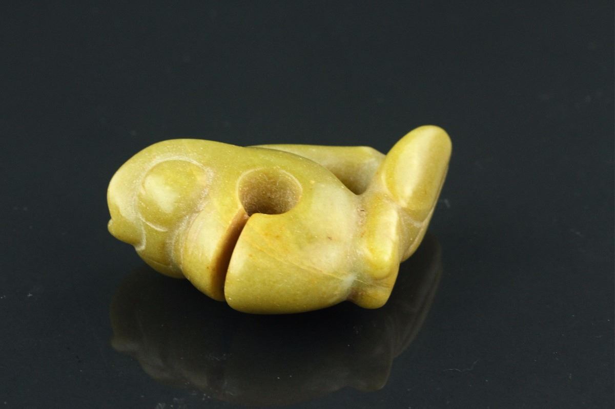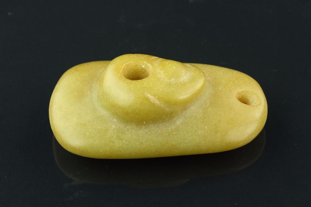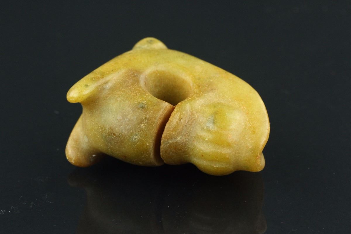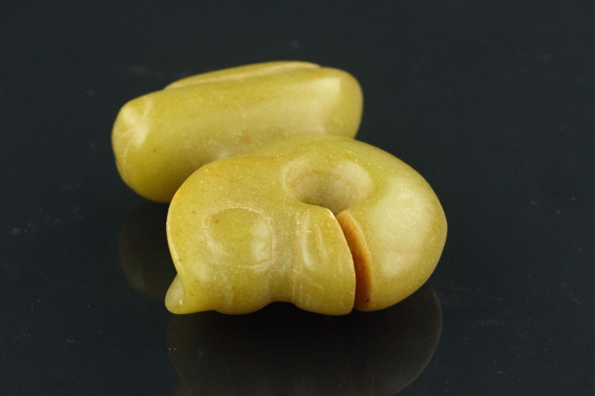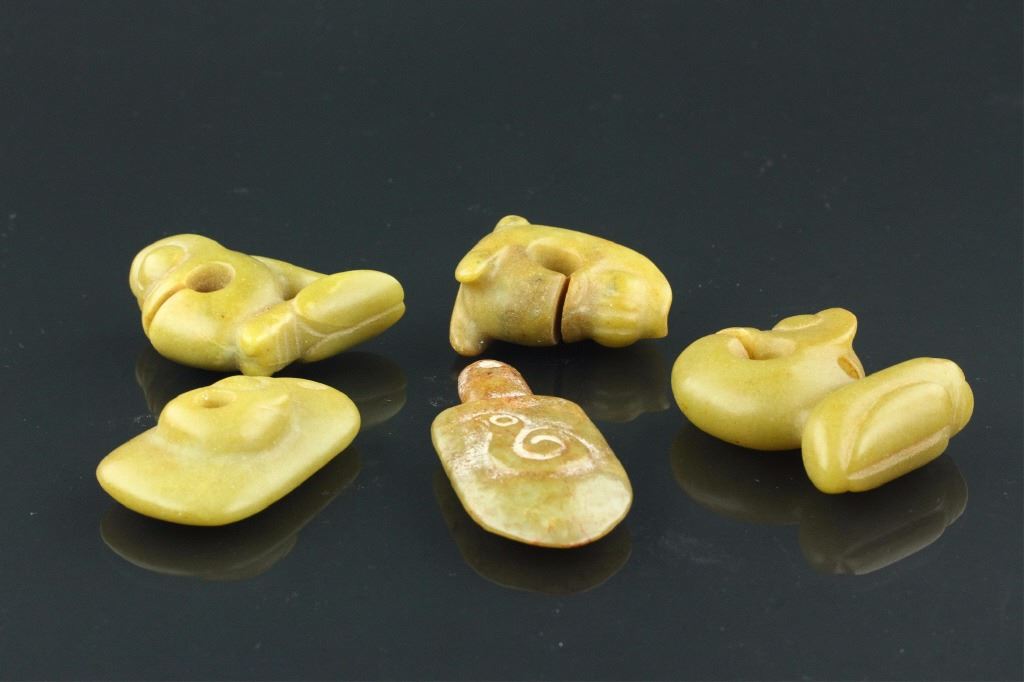 Five pieces of Chinese yellow jade and hardstone carved toggles; featuring dragons with pig heads; pierced for suspension; H: 9 cm, W: 4 cm, 409 grams total