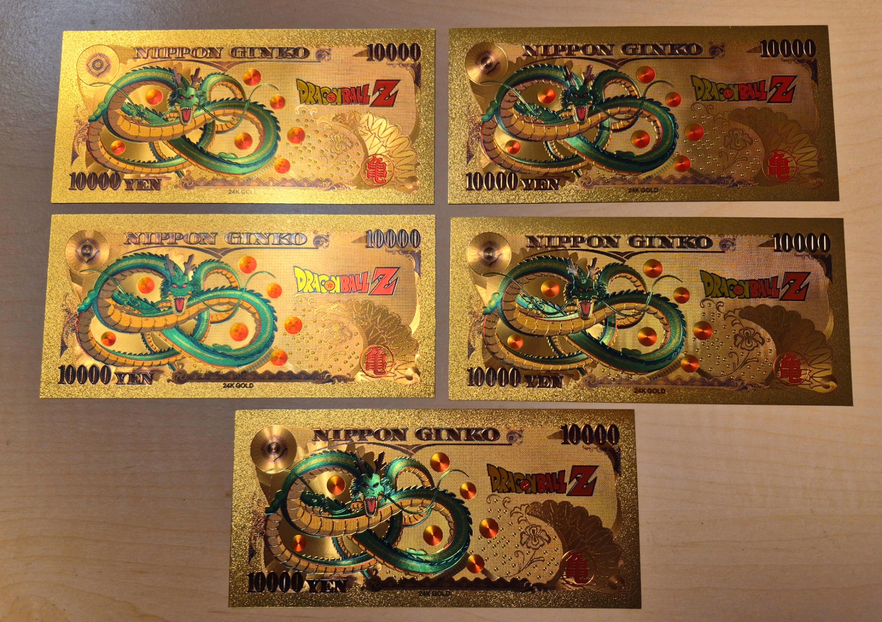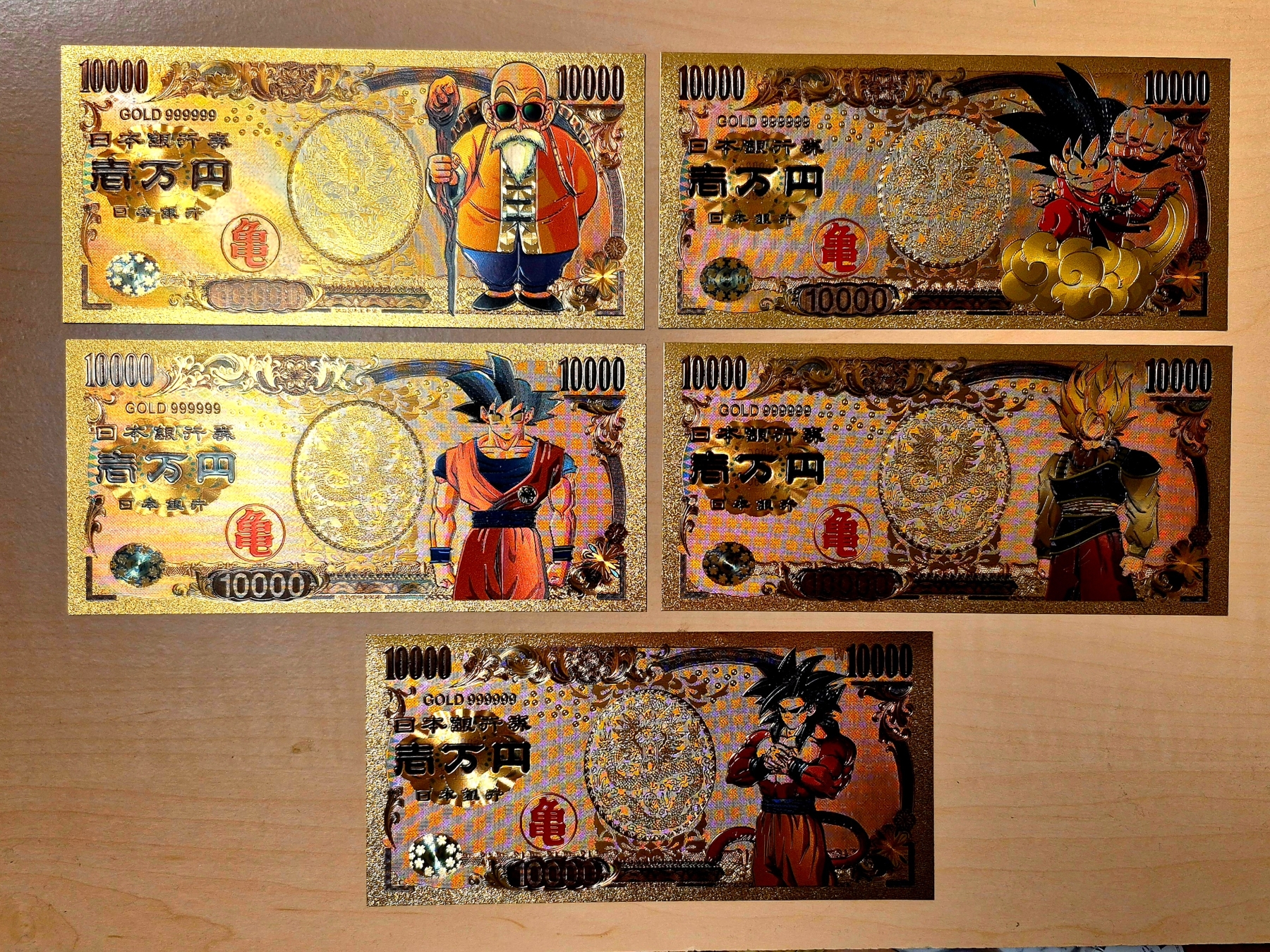 5 Pc Set Pure 24k .999 Gold Foil "Dragon Ball Z" Nippon Ginko Bank Notes - Each In Mint Condition - This offering is a continuation of the previous set of 6 for a total of 2 lots listed and 11 notes in all. These Highly Collectible Japanese Game Characters depicted on each note are authentic characters from the Dragon Ball Z gamiong universe. Processed in Pure Gold Foil, Colorized and Embossed, producing a shimmering golden collectible piece of Japanese Digital Gaming Art. The gold foil is sealed between ultra thin super clear laminate. Overall weight of each note is 3 to 4 grams.