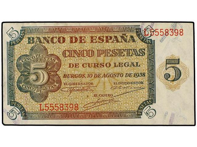 5 Pesetas. 10 Agosto 1938. Serie L. (Varias esquinas con pequeñas dobleces). Ed-D36a. SC-.