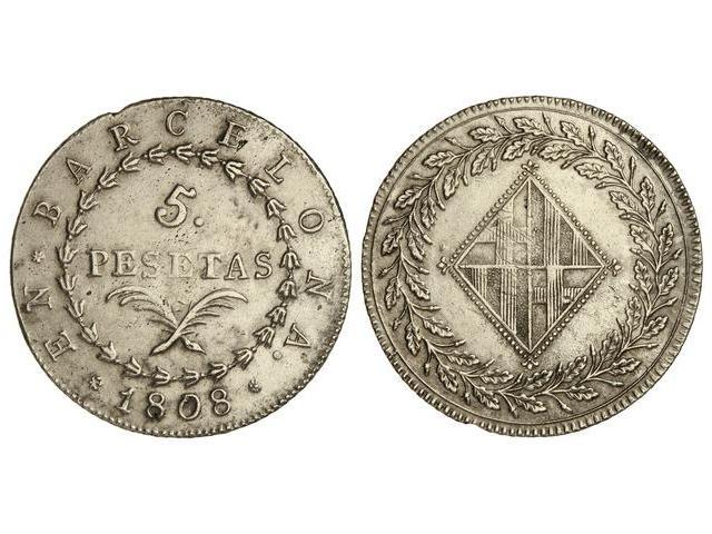 5 Pesetas. - 1808. - BARCELONA. - (Pequeñas rayas de ajuste en reverso. Golpecito en canto). Cal-13. MBC+/EBC-. - -