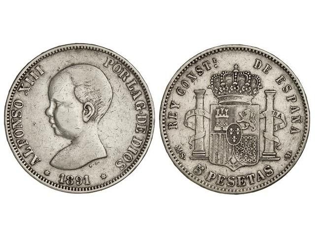 5 Pesetas. 1891 (*_8-8_). M.S.-M. AR. ESCASA. Vti-124 Fi. MBC.