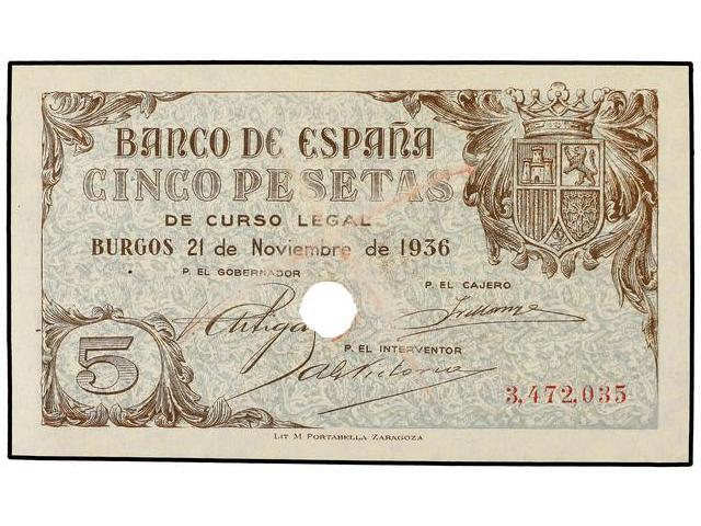 5 Pesetas. - 21 Noviembre 1936. - X manuscritas, borradas en anverso y reverso. Taladro central. (Punto de aguja). Ed-D18. SC. - -