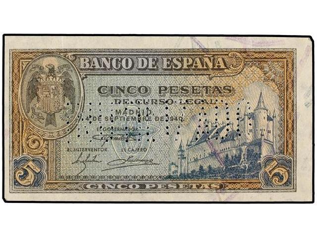5 Pesetas. 4 Septiembre 1940. Alcázar de Segovia. Serie B. INUTILIZADO en perforación. Ed-D44a; LB-253i. MBC+.