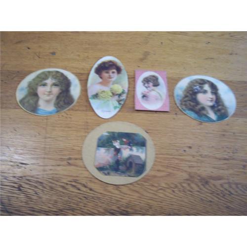 These are so pretty they should be framed.The rectangle one has no name,marking on it,the oval one says CHRYSANTHEMUMS-Copyright 1907,R.HILL,the two round ones of women have the name RYLAND on them and Copyright 1902,By The N.K.Fairbank Co.One of them has a lightsmudge in a couple of places,the other round one of two boys and a dog has no printing on it.The two round ones of ladies are 5 3/4" across,the oblong one is 7 3/4" long and the rectangle one is 5" long.