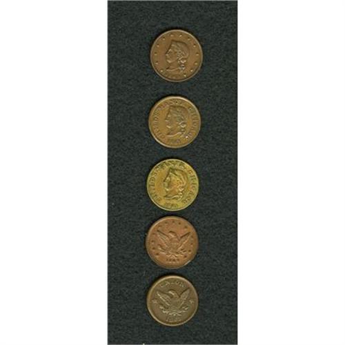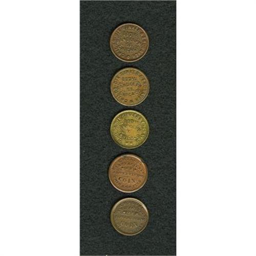<B>5-Piece Child's, Chicago Civil War Merchants Group.</B></I> Five Civil War merchant tokens, varying grades, issued by Child's of Chicago, Illinois. <B>Fuld-IL150J-1a, R.5; IL150J-8a, R.2; IL150J-11b, R.7; IL150K-4a, R.3; </B></I>and<B> IL150K-6a, R.5.</B></I><BR><BR><b>Shipping:</b> Coins & Currency (<a target="_blank" href="http://www.heritageauctions.com/common/shipping.php">view shipping information</a>)