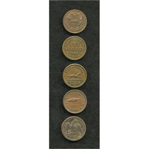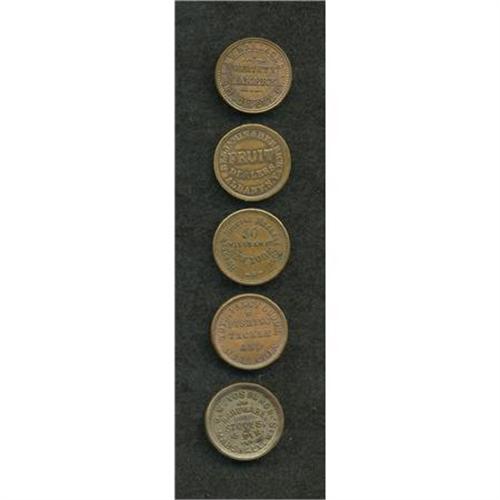 <B>5-Piece Lot of Civil War Merchant Tokens.</B></I> Varying grades issued by merchants from three different states: <B>Fuld-CT35B-1a, NY10A-1a, NY630AK-1a, NY695A-2a,</B></I> and <B>WI435B-1a.</B></I><BR><BR><b>Shipping:</b> Coins & Currency (<a target="_blank" href="http://www.heritageauctions.com/common/shipping.php">view shipping information</a>)