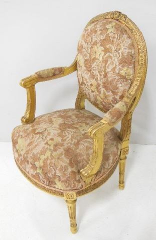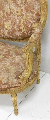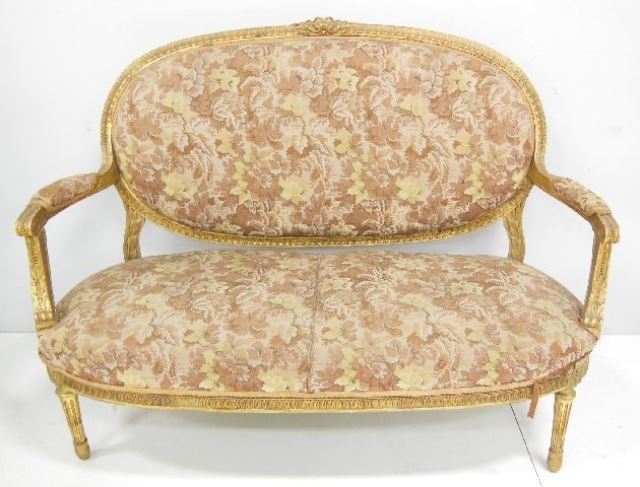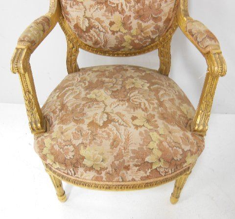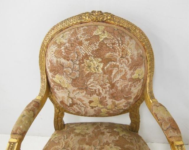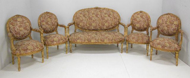 Louis XVI style. Ca 1920s-30s. Including loveseat and 2 pairs fauteuils. "Floral" upholstery. Carved "floral" crest. Loveseat approx. 42" H back x 155" arm to arm x 23" D. Fauteuils approx. 38 1/2" H x 24" arm to arm x 24" D.