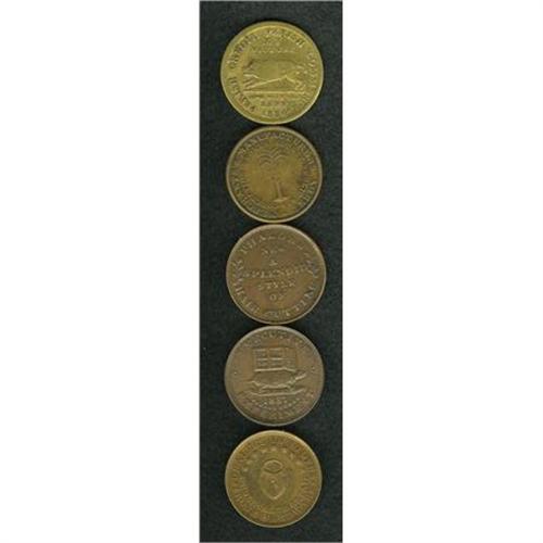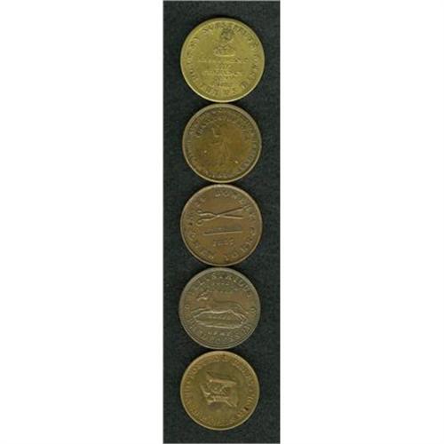 <B>5-Piece Hard Times/Other Tokens Lot.</B></I> This nice lot consists of the following tokens listed by their HT or Miller numbers. <B>HT-10,</B></I> brass; <B>HT-33, brown Uncirculated; HT-304, XF; Miller-10, XF;</B></I> and <B>Miller SC-5a,</B></I> copper.<BR><BR><b>Shipping:</b> Coins & Currency (<a target="_blank" href="http://www.heritageauctions.com/common/shipping.php">view shipping information</a>)