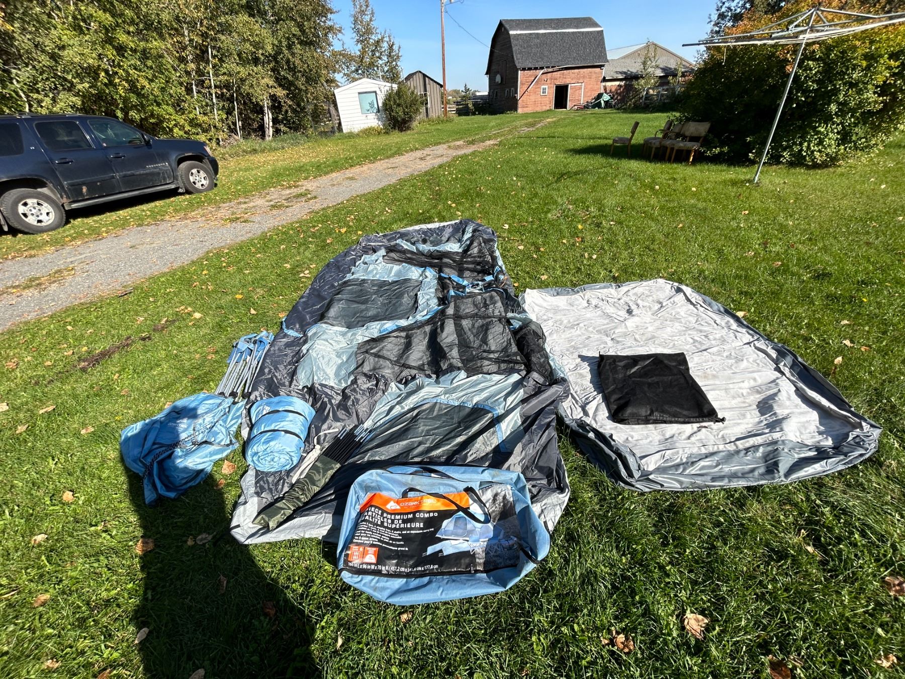 5 Piece Premium 6 Person Camping Tent With 1 Sleeping Bag And 2 Chairs Some Items Need Repair