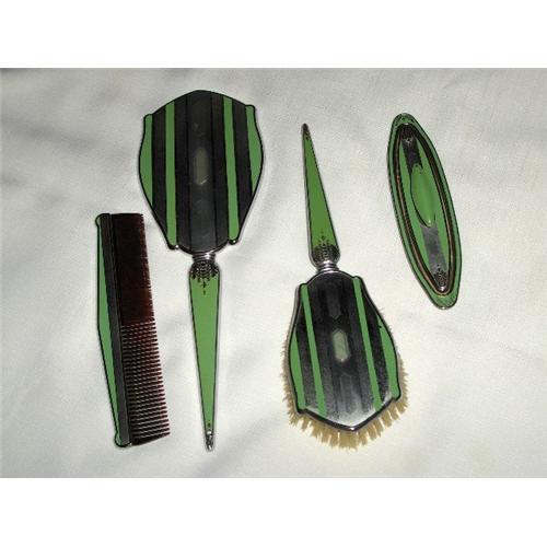From the 1930's, this 5 piece vanity set is in very good condition, the mirror has some paint loss, the buffer has a slight tear where the shammi meets the handle, all other pieces are fine. Very nice set, and well taken care of. This would be an attention grabber in any boudoir. The dimensions are: mirror-13", brush-11", comb-8", buffer tray-7", nail buffer-6". See photos. Have a glance at my other items. Thank you for viewing