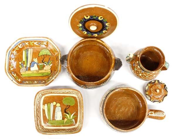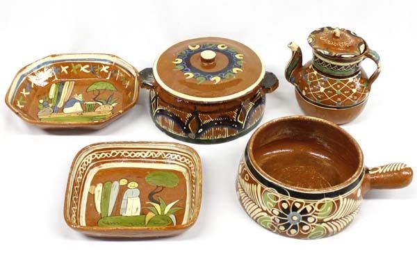 5 Pieces Vintage Mexican Redware Pottery Dishes, largest measures 10.5'' x 3.5'' x 7.5'', includes covered bean pot, dish with handle, coffee/tea pot, and two serving dishes