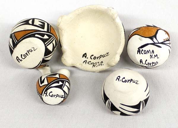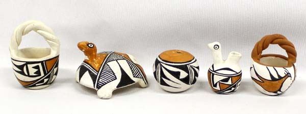 5 Pieces of Native American Acoma Pottery Miniatures by Andrea Corpuz, measures 2'' x 2'' x 1.5'', includes 2 pottery baskets, turtle (some paint loss), seed jar, and effigy pitcher, all are signed