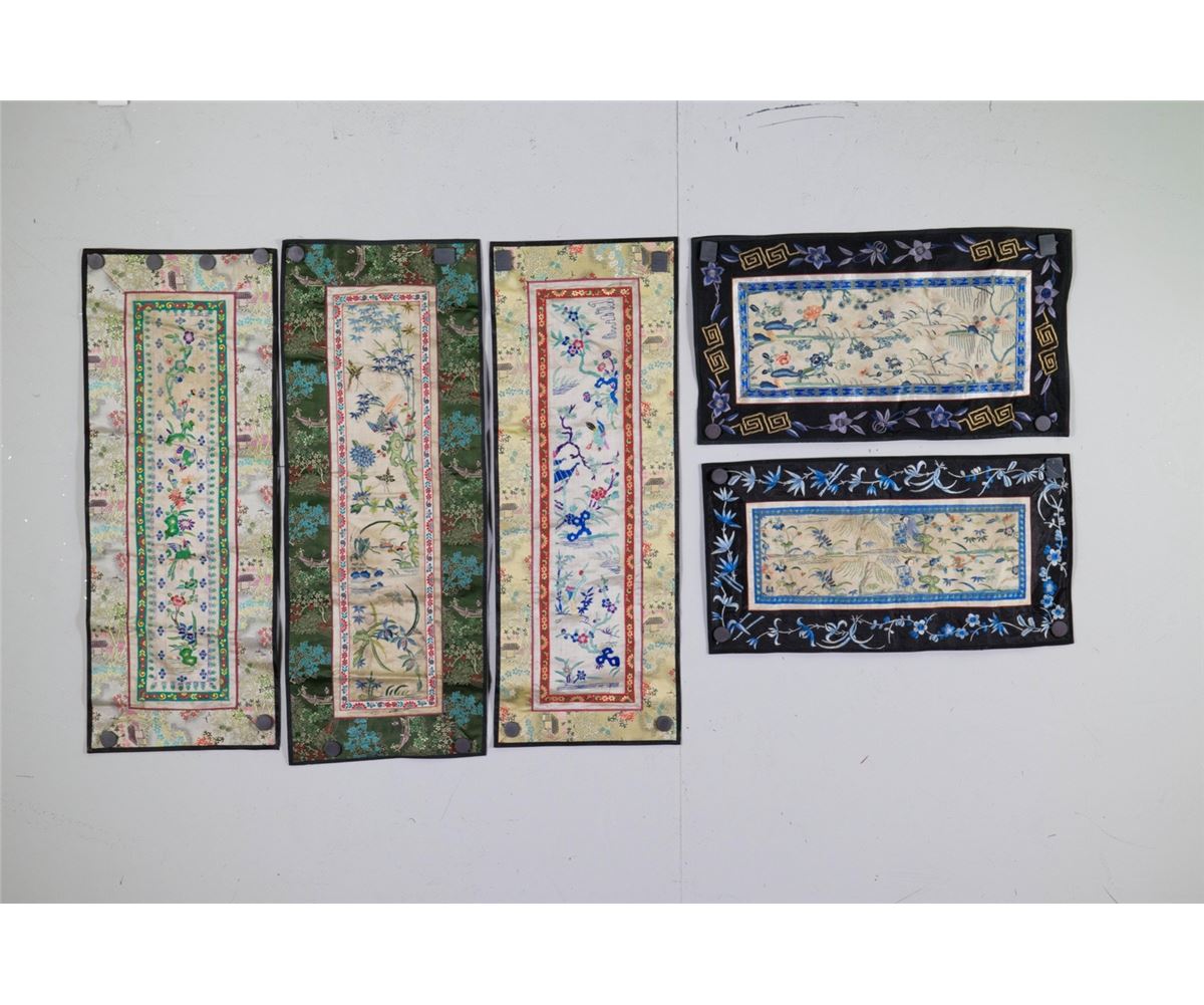 Five pieces of Chinese embroidery handmade panels; of rectangle form; featuring flowers and birds on silk; H: 62 cm, W: 23 cm, 259 grams