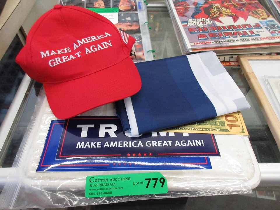 Cap, 2 bumper stickers, Gold foil novelty note and flag.