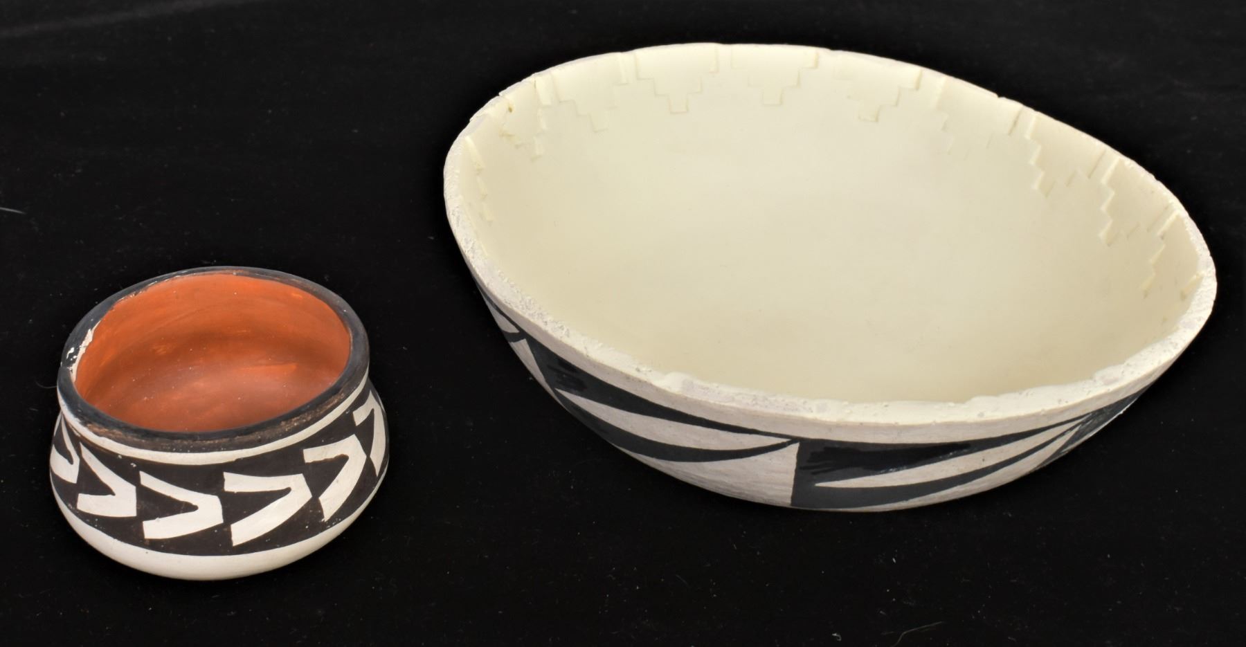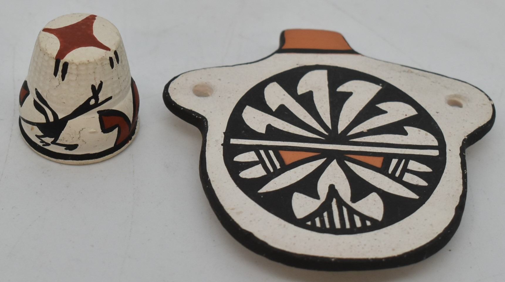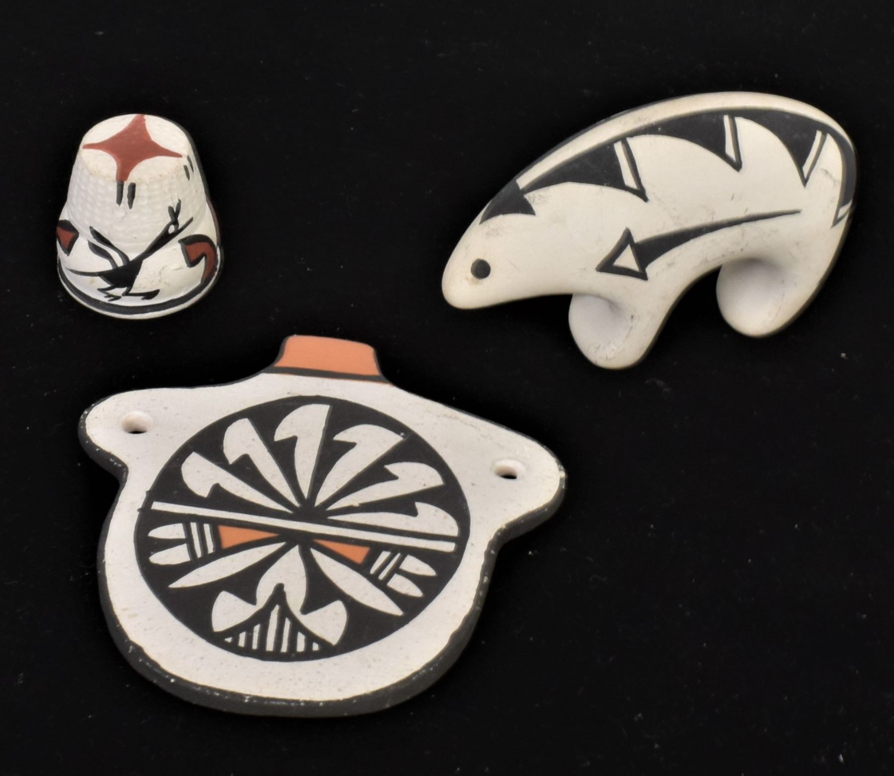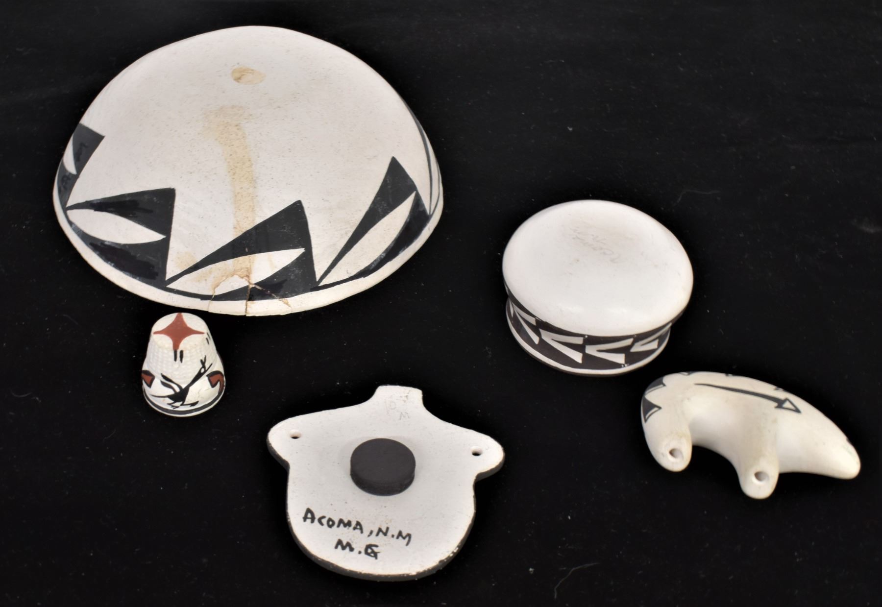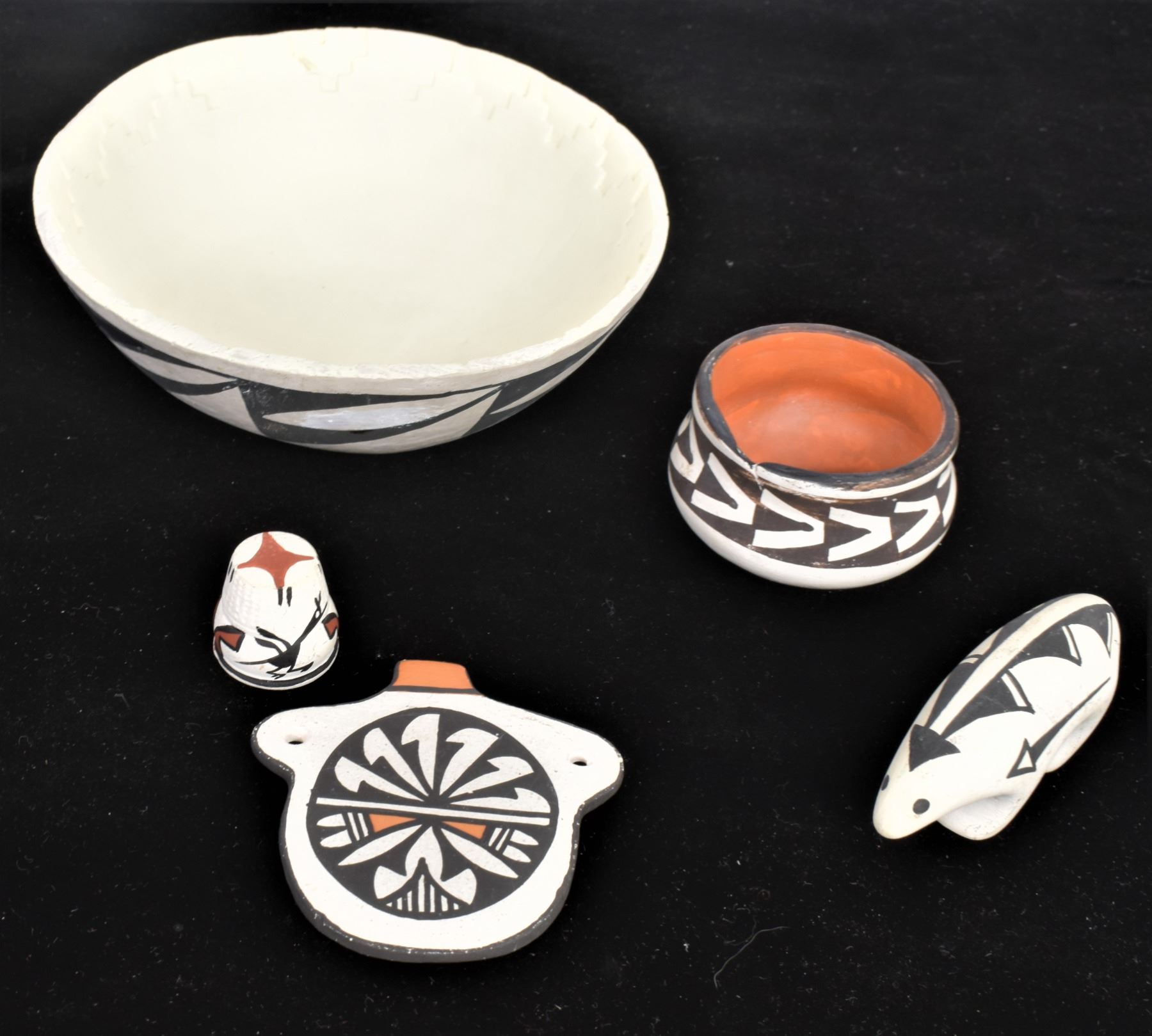 5 Pieces of Native American Pottery, includes 1. Small Acoma Pottery Bowl, chip in rim 2. Acoma Hand Painted Ceramic Bear 3. Acoma or Isleta Hand Painted Ceramic Thimble 4. Acoma Hand Painted Pottery Magnet, artist's initials on back 5. Acoma Carved Pottery Bowl, largest measuring 2'' x 6''D, rim has been repaired