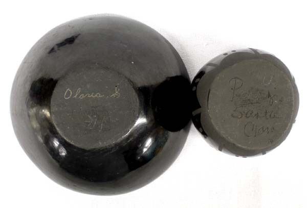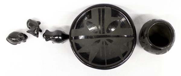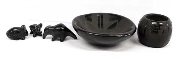 5 Pieces of Native American Santa Clara Pottery, includes: A. Black Pottery Jar by Penny Martinez, measures 2'' x 2.5'', signed on the bottom B. Shallow Bowl by Olaria Sisneros (1908 - 2003), measures 2'' x 4.5'' and is signed on the bottom, black on black lines and designs, nice thick walled heavy piece C. Anteater or Armadillo by Dorothy Gutierrez, Lizard by Dorothy Gutierrez, Frog by Paul and Dorothy Gutierrez, largest measuring 2.5''L all are signed on the bottom FYI: ''Dorothy (Corn Maiden) 1940-present and Paul (White Corn) Gutierrez 1936-2017: He was born into the Santa Clara Pueblo and she into the Navajo Nation. Dorothy and Paul specialized in storytellers, mudheads, angels, animals, ornaments and nativities. They worked as a team with Dorothy forming the figures and Paul doing the polishing and finish work. Dorothy is carrying on the work they began together.''