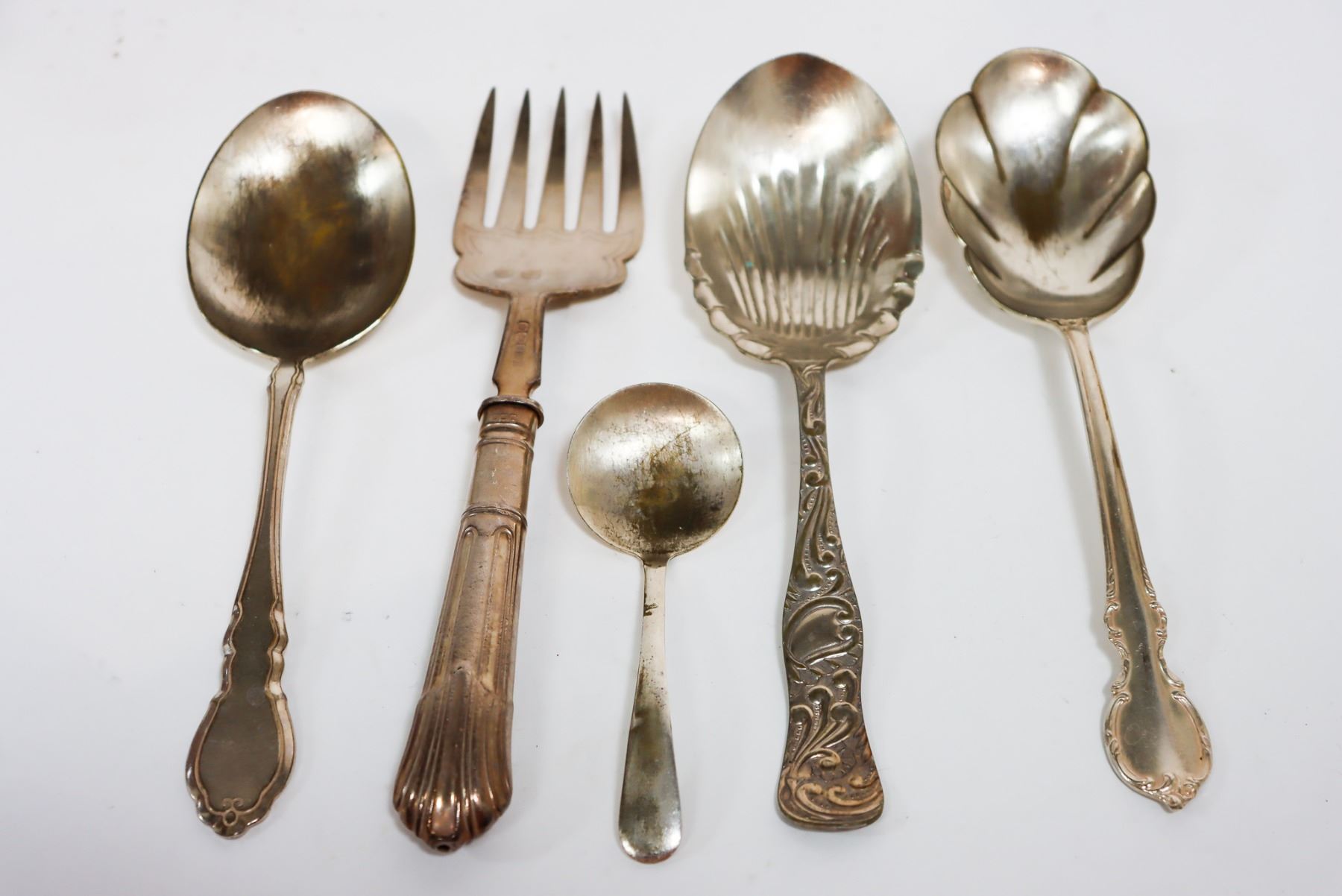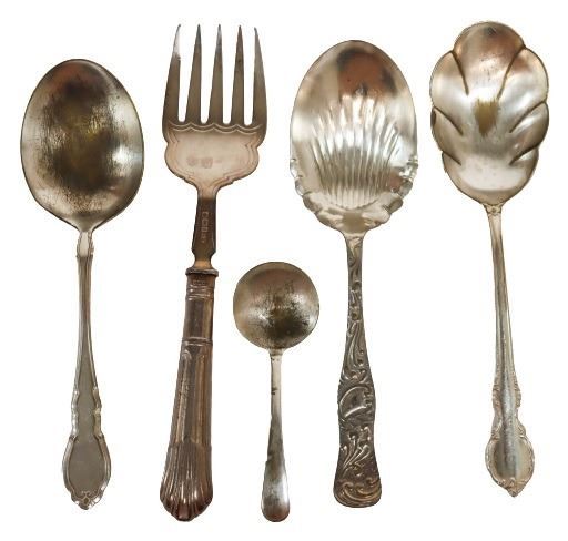 Five piece in total of mixed plated silver service ware. Approximately 7 in. length.