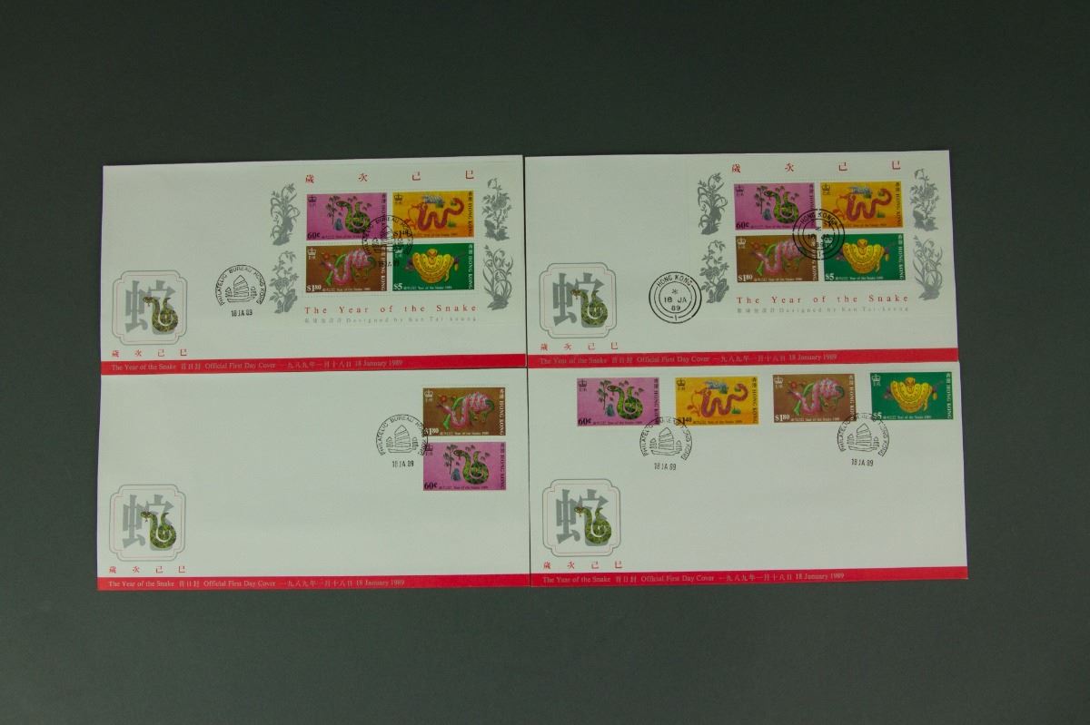 Five pieces of commemorative postcards with stamps; issued on 1989 for the year of snake and 1984 for the 23rd olympic games; all with postmarks; 2.9 cm × 2.3 cm, 2.5 cm × 3.7 cm