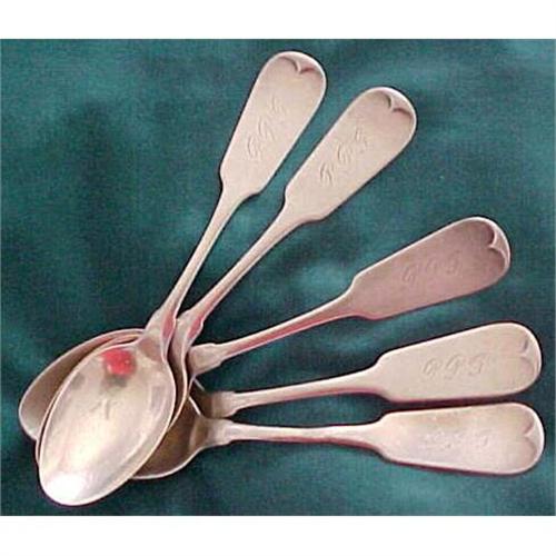 This is a set of five early coin silver spoons by Whiting.  They are in the Plain Tip pattern, first introduced in 1870.  These spoons measure 5.75" long, are monogrammed and in extremely good condition.  Shipping to US addresses is $7.