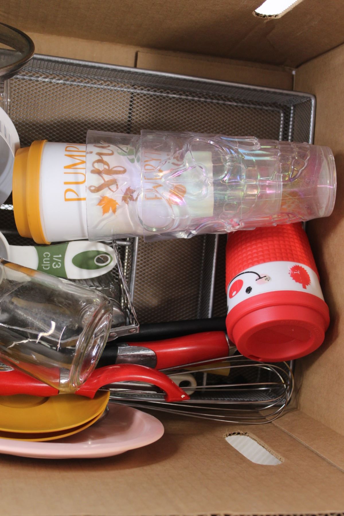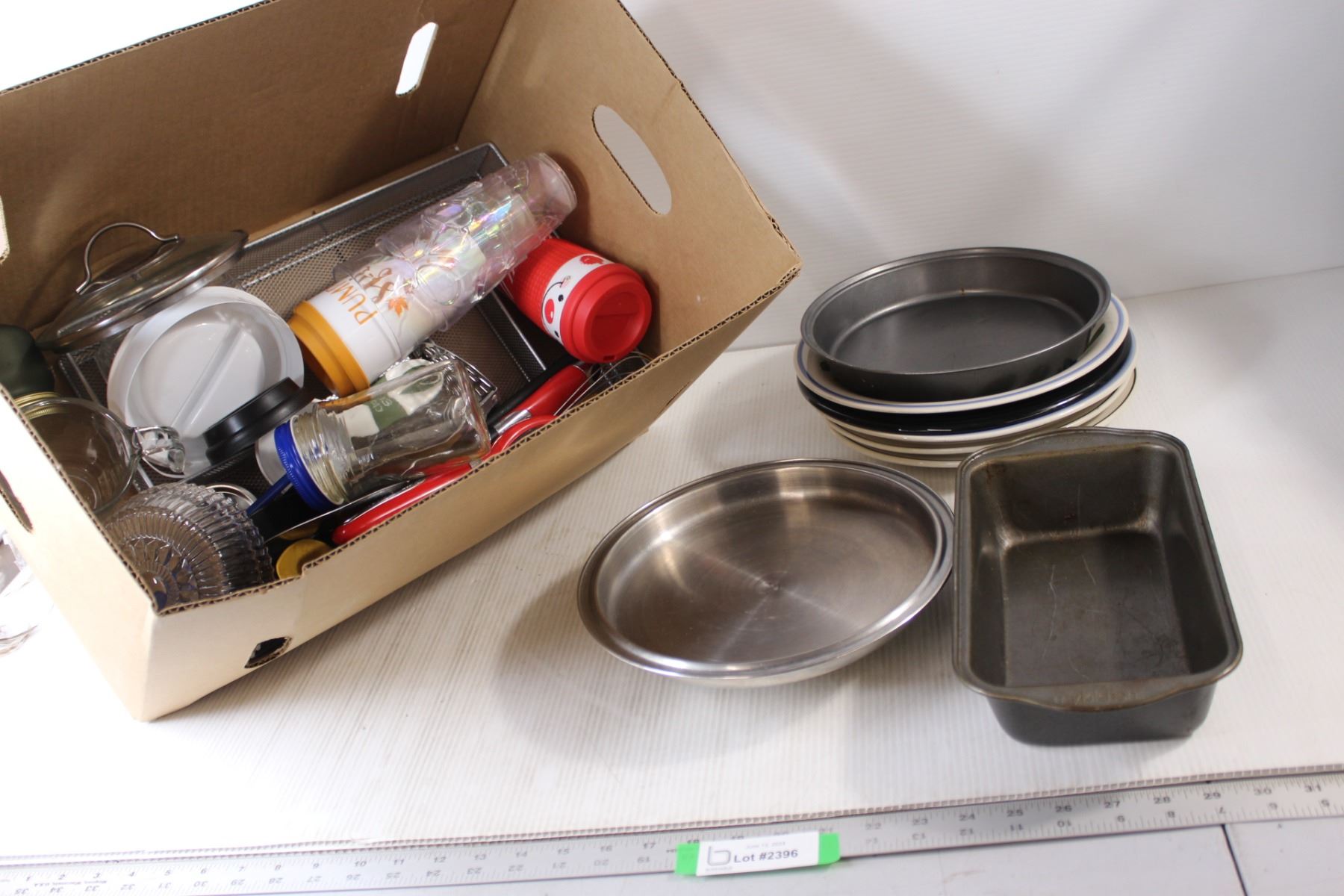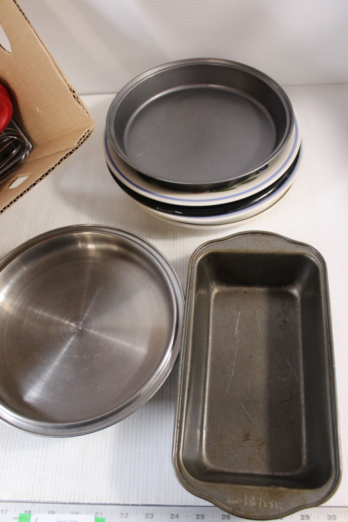 (5) Plates, Bread Pan, Cake Pan, Assorted Kitchen Items