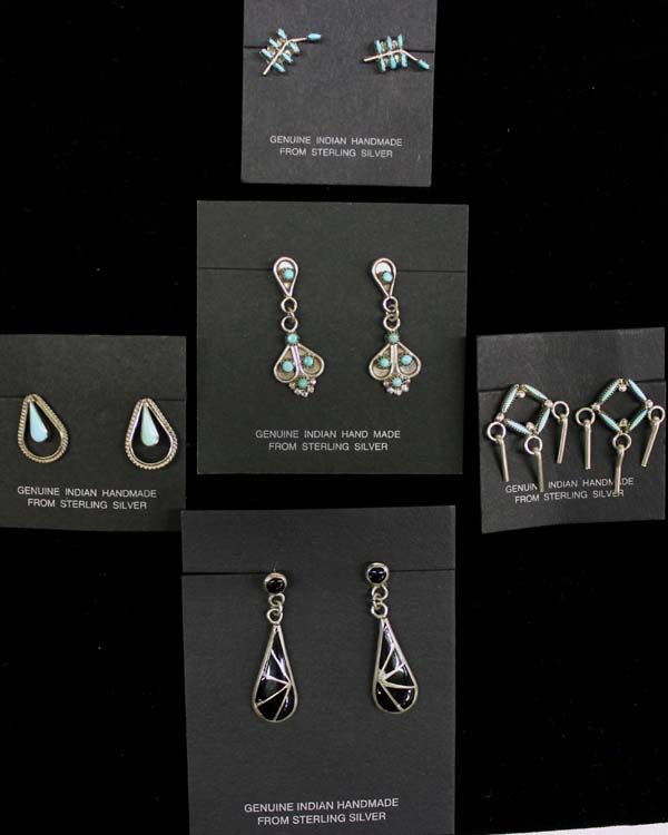 5 Pr Navajo and Zuni Sterling Earrings, 4 Zuni and 1 Navajo, longest pair (onyx) measures 1.25''L x 3/8'', clutch post pierced