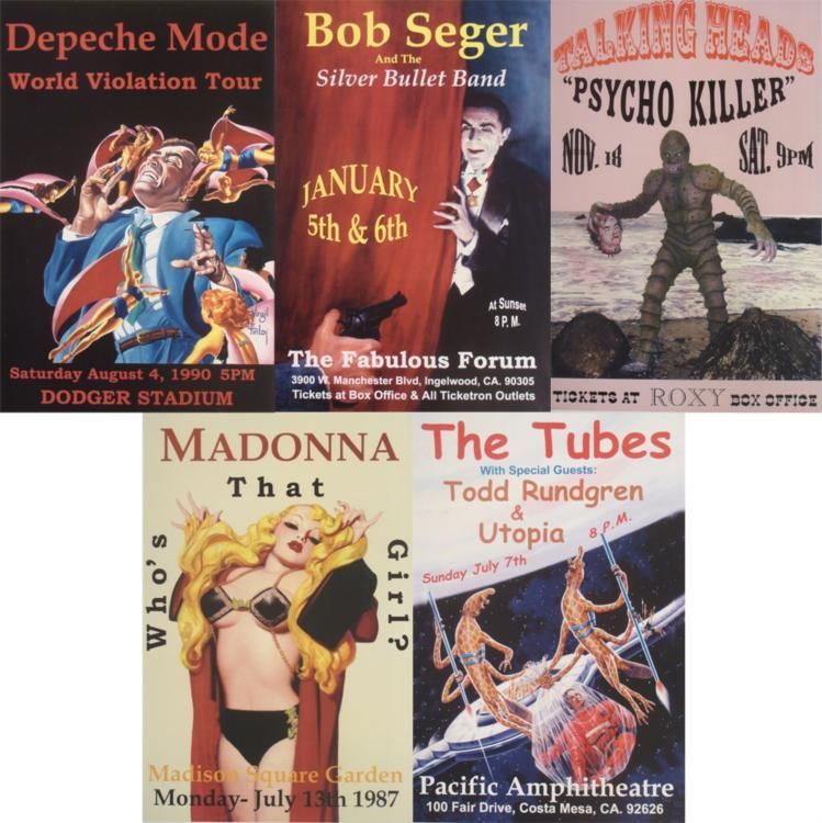 These are 5 reproductions of original concert posters from The Whisky a Go Go in Los Angeles, featuring some great late 1960's psychedelic rock bands. * Size: 13 1/2" x 20" (approximately) Medium: Heavy Poster Stock Condition: Excellent The artists include: Bob Segar and the Silver Bullet Band (Ingelwood, CA) Talking Heads "Psycho Killer" (Roxy) Madonna "Who's That Girl" (Madison Square Gardan, July 13th 1987) The Tubes w/ Todd Rundgren & Utopia (Pacific Amphitheatre, Costa Mesa, CA) Depeche Mode World Violation Tour (Dodger Stadium, August 4, 1990) * Note: These are older reproduction prints, not original posters