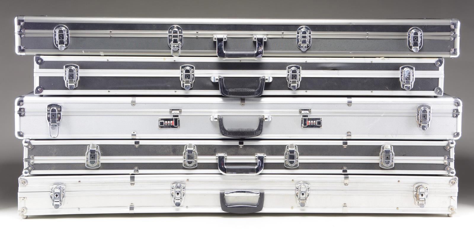 This lot includes 5 hard cases that generally measure approx. 53” x 14” x 5”. Two of the cases are all metal, and three of the cases are black with metal trim. Manufacturers include San Angelo & Guard Force, but three have no exterior label. CONDITION: cases generally show very light wear. One case has a small dent on one end, not affecting the integrity of the case. (02-21371/BF). $150-300.