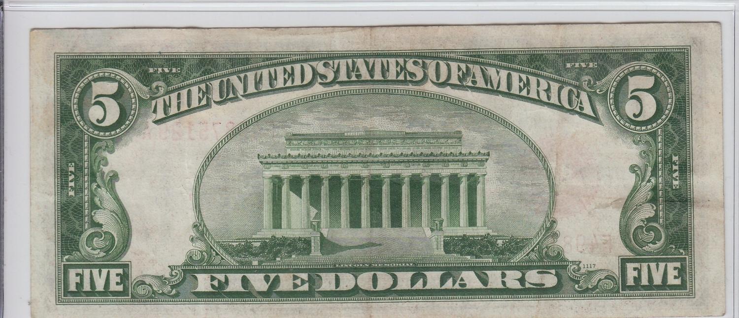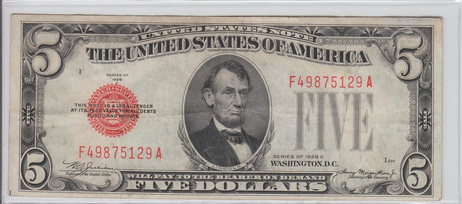 $5 RED SEAL 1928 C SERIES LEGAL TENDER