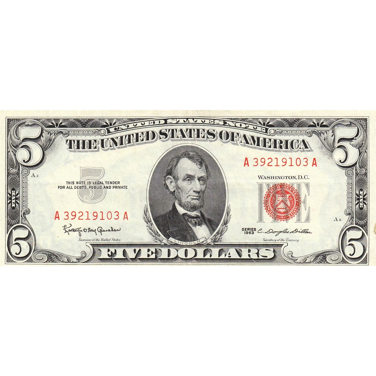 $5 RED SEAL LEGAL TENDER 1963 CHERRY SEAL CRISP