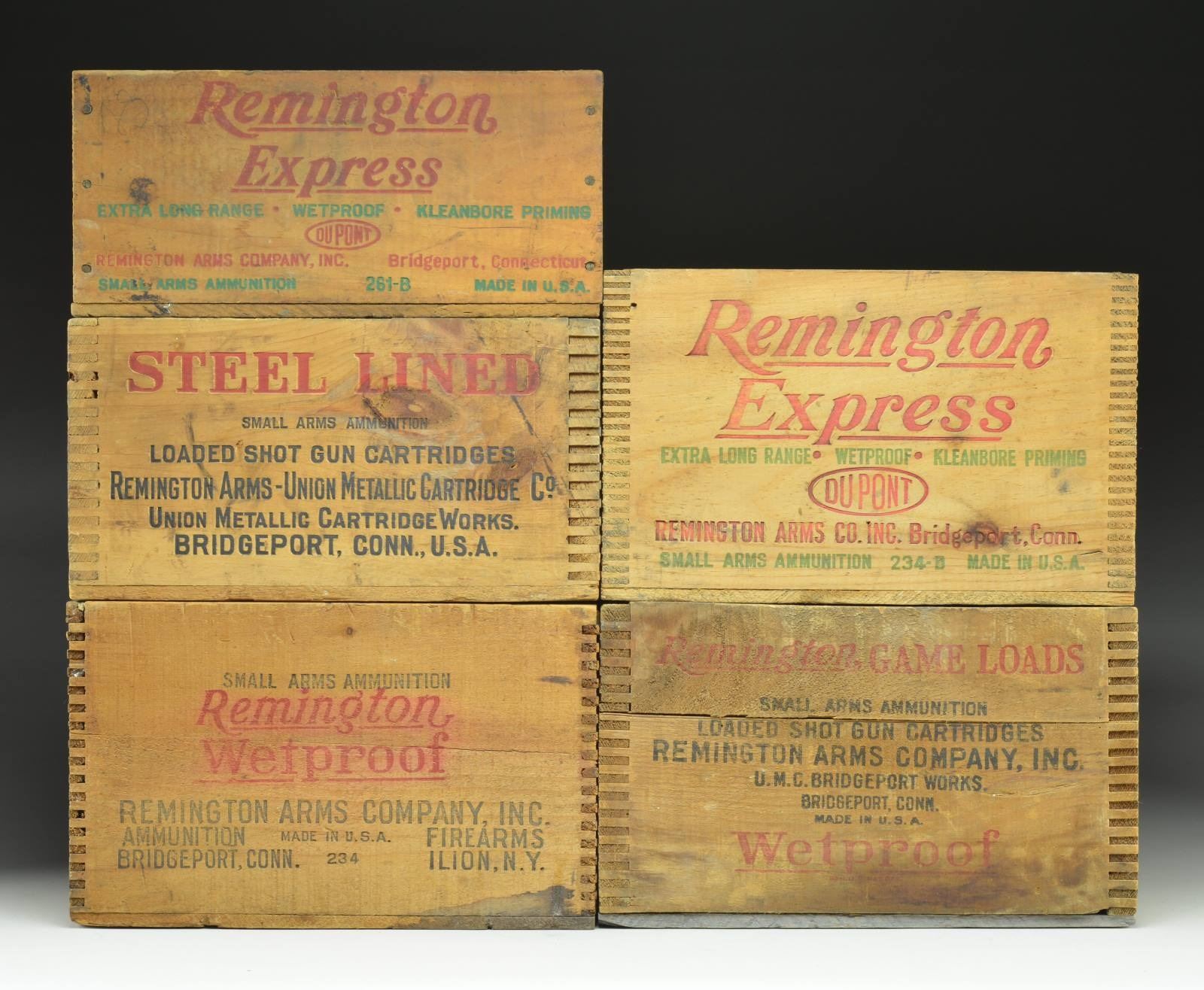 1 for 410 Express. / 2 Nitro Club 12 Ga. / 1 Nitro Club 20 Ga. / 1 Arrow 12 Ga. CONDITION: fair to good overall w/ missing pieces of wood, staining, cracks, & dents. (02-16599-18/MD). $100-200.
