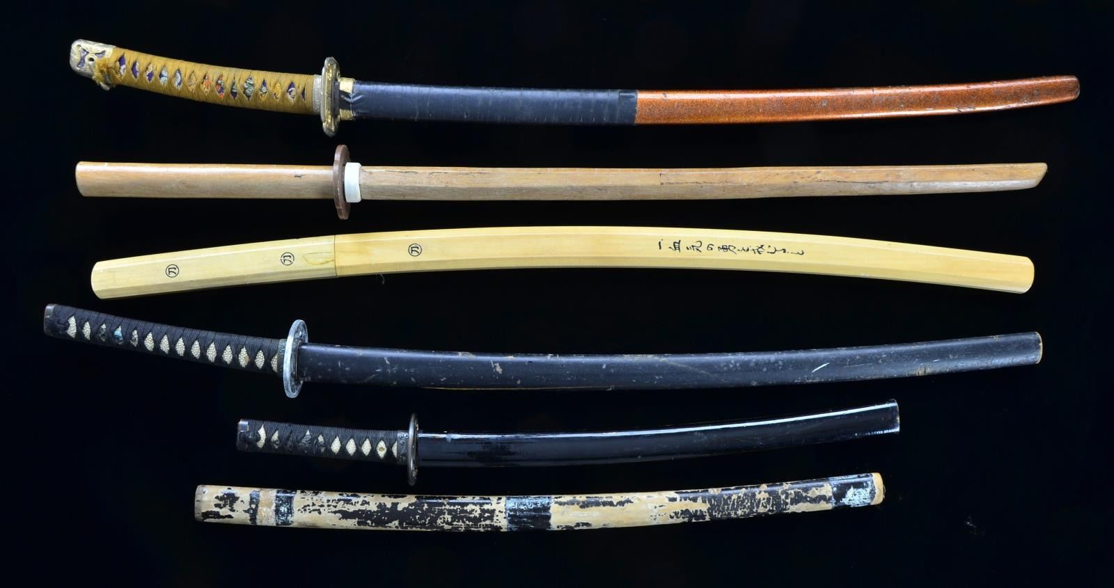 1) KATANA IN STORAGE MOUNTS. Overall length: 39". Blade length: 26 3/4". Blade has a simulated wavy irregular hamon & has a gold colored habaki. Wooden storage mounts have Japanese characters written in black. CONDITION: very light wear. 2) KATANA. Overall length: 41". Blade length: 29". Blade has a simulated wavy irregular hamon. Copper habaki. Black pot metal tsuba. Black wrapped tsuka. Wooden saya. CONDITION: general light wear. Oxidation on tsuba. Broken saya. 3) WAKIZASHI. Overall length: 27". Blade length: 19". Blade has a simulated wavy hamon. Copper habaki. Gilt highlighted black metal tsuba. Black wrapped tsuka. Wooden saya. CONDITION: general light wear. Blade edge has several nicks. 4) KATANA. Overall length: 41". Blade length: 28 3/4". Blade has a simulated wavy irregular hamon. Copper habaki. Gold pot metal tsuba. Brown wrapped tsuka. Wooden saya w/ speckled copper finish. CONDITION: blade shows significant oxidation. Tsuka shows moderate wear. Saya has electrical tape repairs. 5) PRACTICE KATANA. Overall length: 39 1/2". Blade length: 29". A solid wood practice katana w/ a plastic tsuba & habaki. CONDITION: light wear. 6) KATANA SAYA. Overall length: 28 1/2". Black painted wooden saya. CONDITION: relic. (02-14493/BF). $100-300.