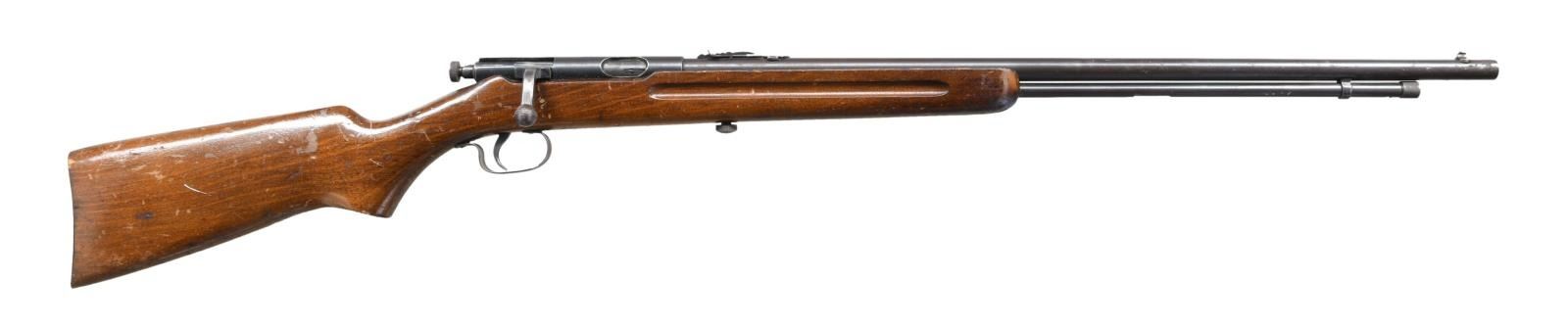 SHOTGUN. 1) WESTERN FIELD MODEL 31 BOLT ACTION RIFLE. Cal. 22 LR. NSN. Bbl. 24". Tube fed bolt action rifle. Elevator adjustable rear sight. Bead front sight. Pistol grip walnut stock. CONDITION: stock shows scattered flaking varnish, dings & handling marks. Metal retains perhaps 20% original blue w/ overall fading to brown & scattered oxidation. Good bore that will likely clean up better. (23-1570/MJC). 2) SGDG BELGIUM ROUGH RIDER BOLT ACTION RIFLE. Cal. 22RF. S# 47458. Bbl. 18". Single shot Belgian made bolt action rifle. Fixed square notch rear sight. Rounded blade front sight. European hardwood stock w/ one bottom mounted sling swivel. CONDITION: stock has a glue repaired 2" triangular chip behind upper tang, scattered handling marks & light dings. Metal retains 30% blue w/ overall fading to brown. Fair bore w/ scattered pitting. (23-1573/MJC). 3) WARDS WESTERN FIELDS 04M-495A BOLT ACTION RIFLE. Cal. 22 S, L & LR. NSN. Bbl. 24". Tube fed bolt action rifle. Drum style rear sight. Post style front sight. Pistol grip stock w/ bottom mounted sling swivels. CONDITION: stock has added varnish w/ a couple large areas of flaking, some dings & scattered handling marks. Metal retains 90% original blue w/ some flaking to brown & edge wear. Very good bore. (23-1583/MJC). 4) COOEY ACE MODEL 1 BOLT ACTION RIFLE. Cal. 22 RF. NSN. Bbl.17". Single shot bolt action rifle. Fixed rear sight. Blade front sight. Semi-pistol grip hardwood stock. CONDITION: stock shows large areas of flaking & scattered handling wear. Metal is a silver pewter w/ scattered oxidation staining & light pitting. Good bore. (23-1591/MJC). 5) CJ HAMILTON & SON 43 BOLT ACTION RIFLE. Cal. 22 L &. NSN. Bbl. 16". Single shot bolt action rifle. Fixed V-notch rear sight. Blade front sight. Straight grip stock. CONDITION: refinished stock w/ added varnish, a 2 1/2" crack at left of forend & scattered handling wear. Bbl. jacket has a crack running along its bottom length. Metal is a dull gray patina w/ overall oxidation. Good bore. (23-1597/MJC). 6) KESSLER ARMS CORP LEVERMATIC MODEL 50 SHOTGUN. Cal. 20 Ga., 2 3/4". NSN. Bbl. 26" w/ replacement alloy hex front post. Full choke. Blind box mag. Walnut stock set w/ red recoil pad. CONDITION: very good blue w/ marks. Very good wood finish w/ a few chips & sm. cracks left side of forearm. Bright shiny bore. (23-1602/MD). ALL CURIO. $450-900.