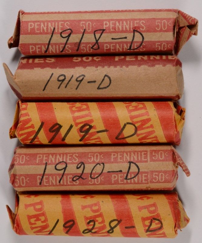 5 ROLLS OF EARLY WHEAT CENTS "D" MINT MARKS 1918-D,1919-D,1919-D,1920-D,1928-D