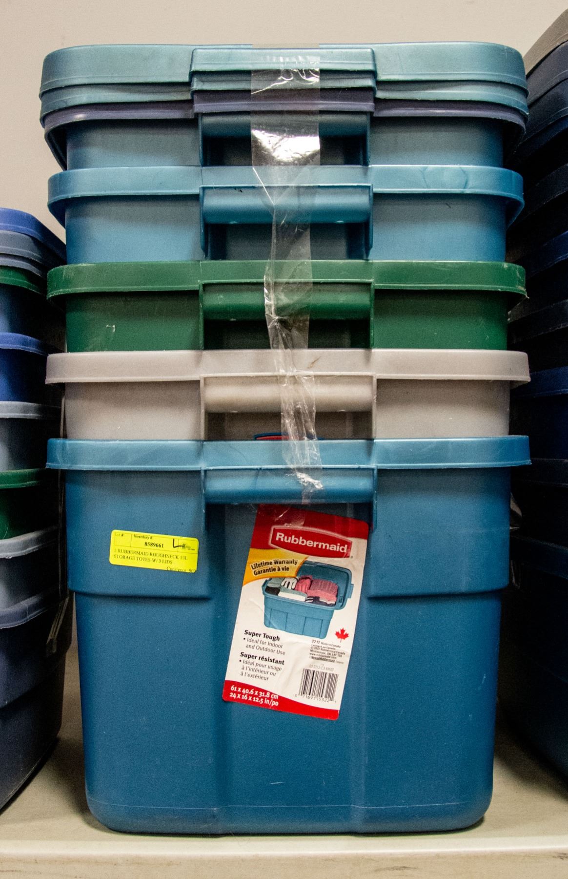 5 RUBBERMAID ROUGHNECK 53L STORAGE TOTES W/ 3 LIDS