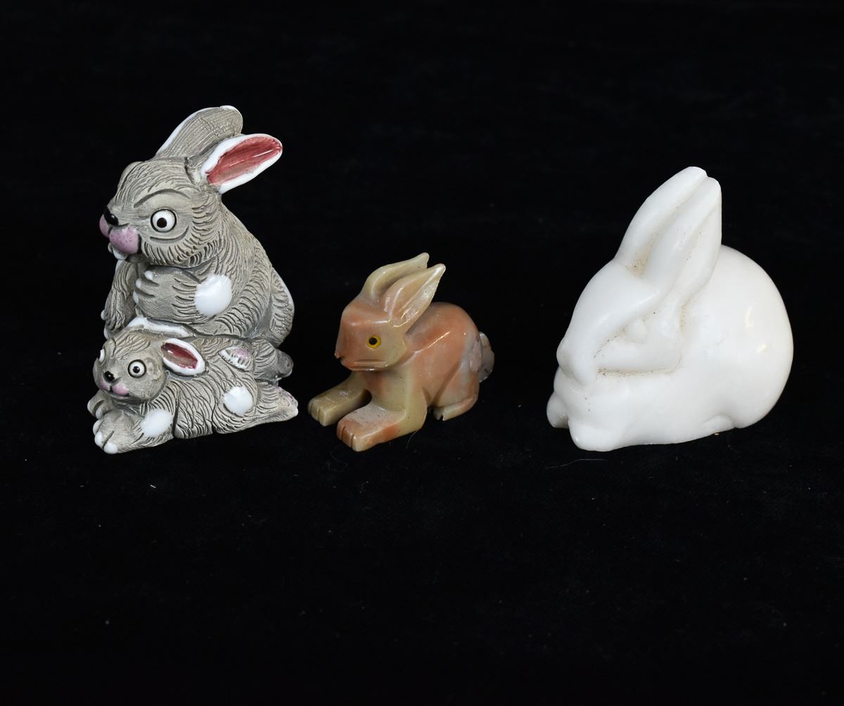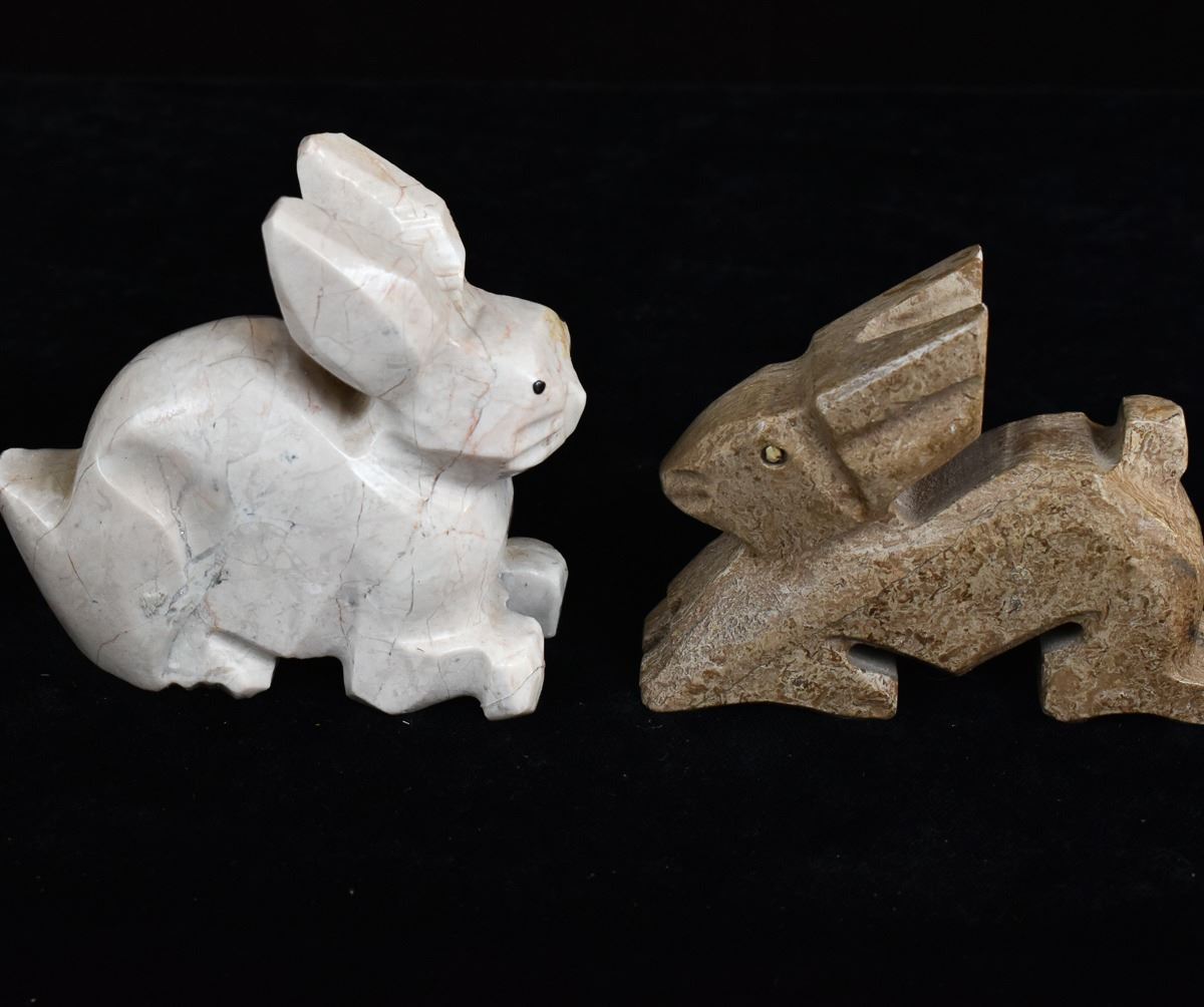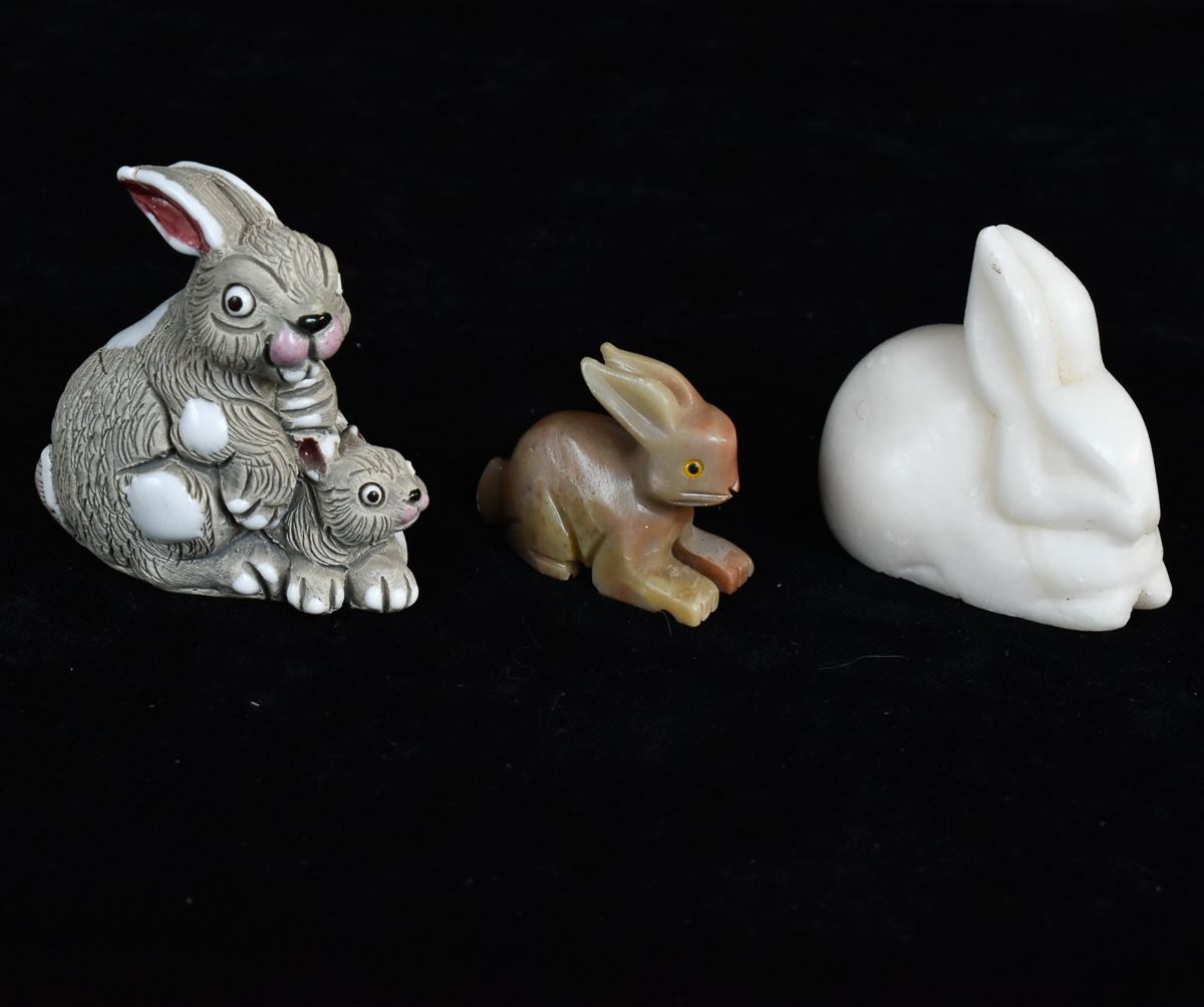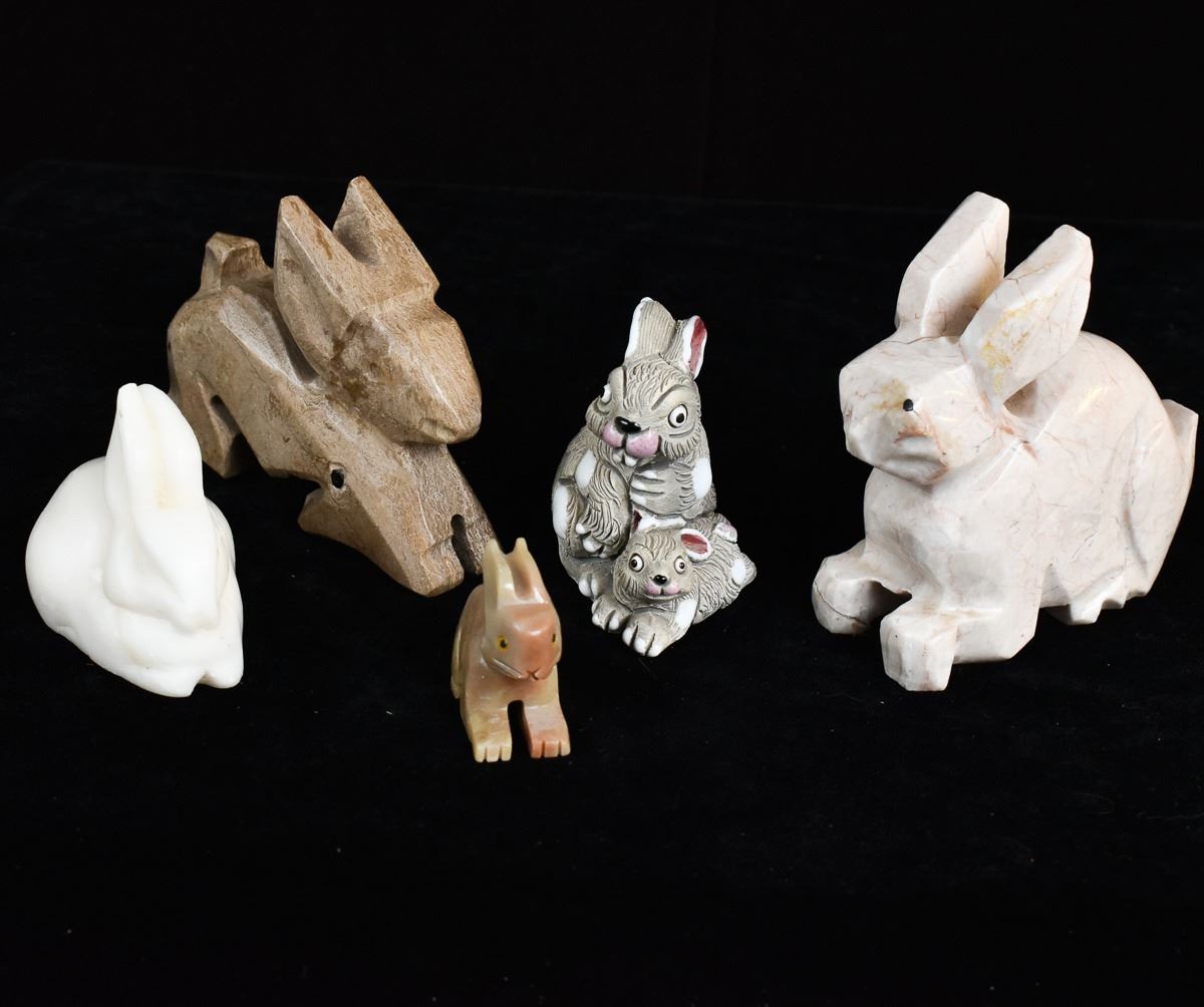 5 Rabbit Figurines, includes 3 Onyx, 1 White Marble, and 1 LEPS Pottery, largest measures 1.25'' x 3'' x 3.5''