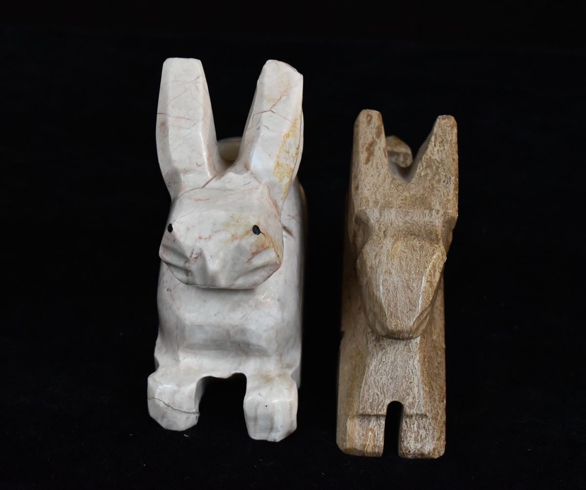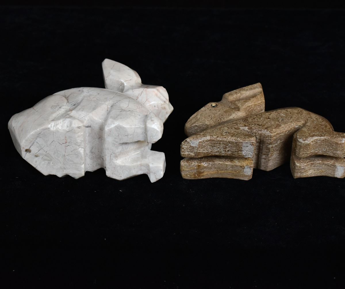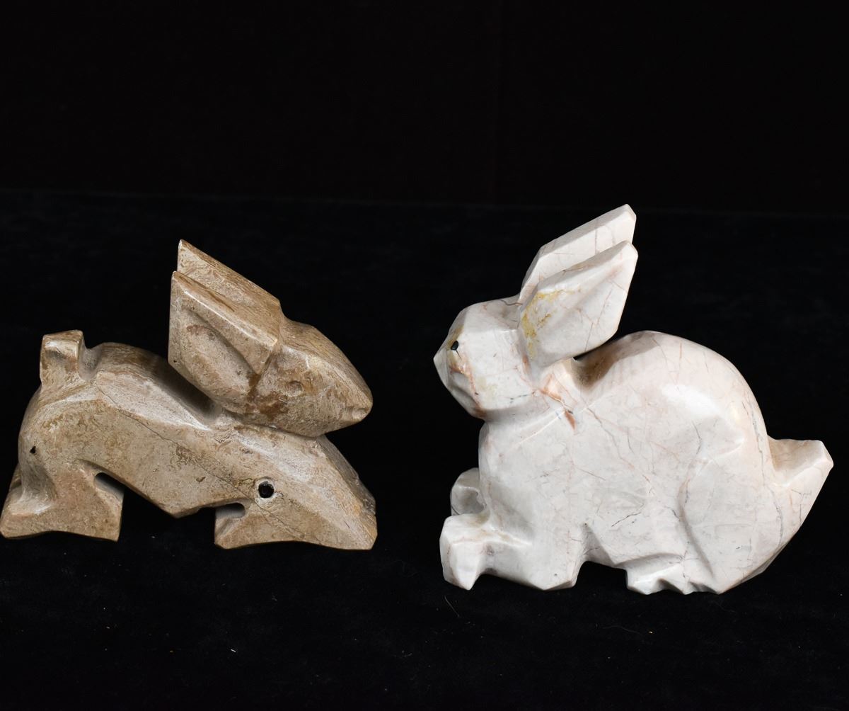 5 Rabbit Figurines, includes 3 Onyx, 1 White Marble, and 1 LEPS Pottery, largest measures 1.25'' x 3'' x 3.5''